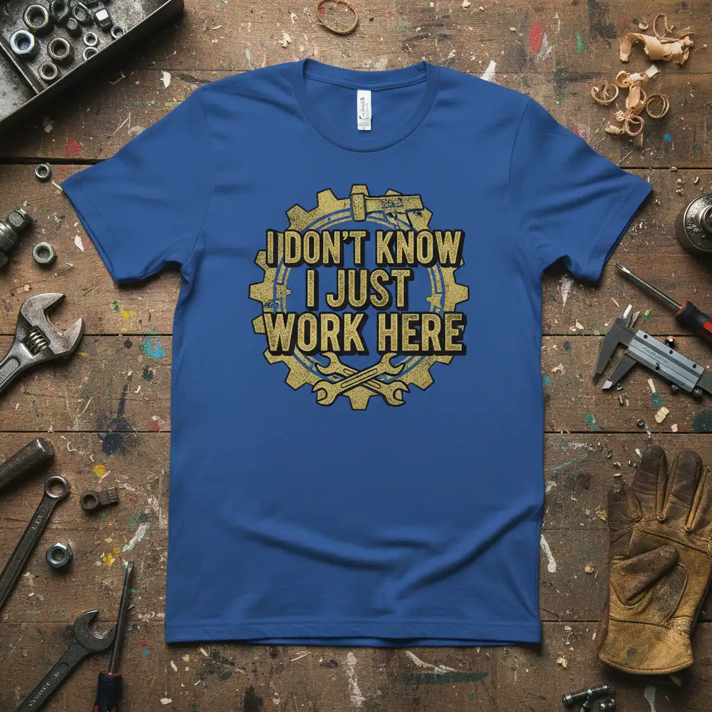 The “I Don’t Know I Just Work Here” t-shirt stands out because it taps into a shared, humorous reality for many. It’s more than just clothing; it’s a badge of honor for those who are hands-on and practical. The design is eye-catching, the message is relatable, and the quality ensures it will be a favorite in any wardrobe.