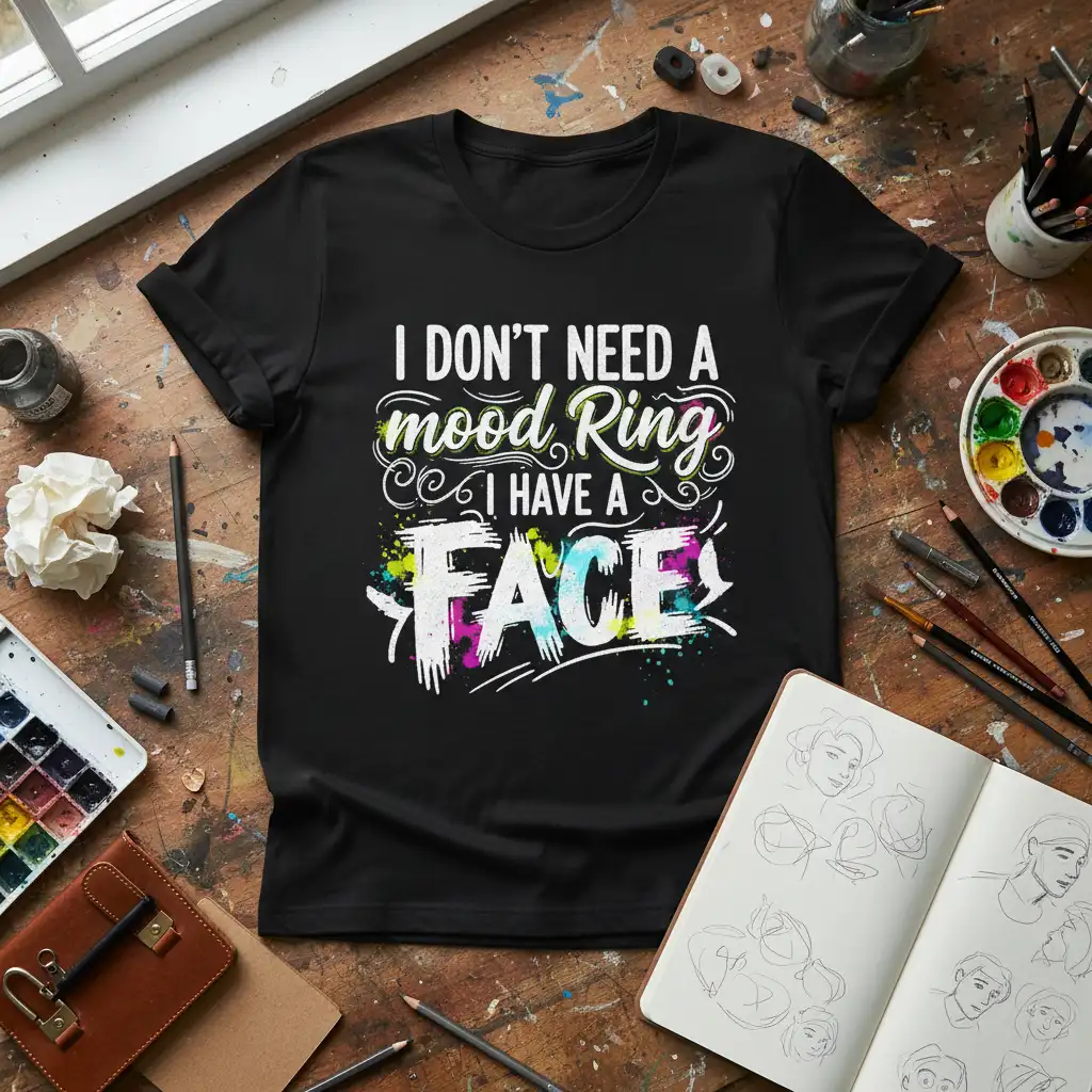 The design features the full quote “I DON’T NEED A mood Ring I HAVE A FACE” in a striking combination of fonts and colors. The stark white lettering contrasts beautifully with the black t-shirt, while splashes of vibrant paint in blue, green, yellow, and pink add an artistic and energetic flair. This visual dynamism makes the shirt not only a witty piece of clothing but also a piece of wearable art.
