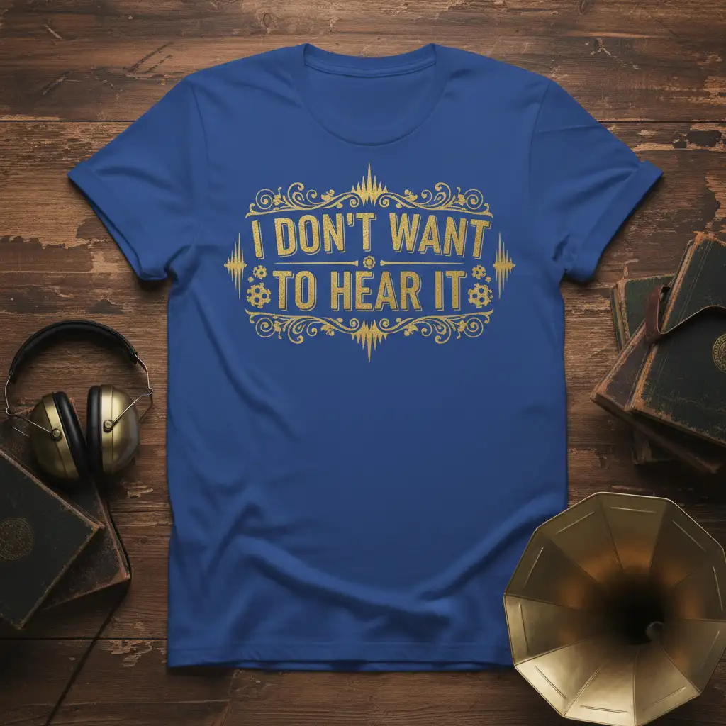 This shirt captures a sentiment many feel but don’t always express. The “I Don’t Want To Hear It” quote is presented in a striking gold font that stands out against the rich royal blue fabric. Decorative ornate borders frame the text, while subtle graphics of soundwaves and gears add a layer of depth and intrigue. It’s a fantastic choice for individuals who possess a dry wit and enjoy apparel that reflects their personality. The design is both humorous and relatable, making it a standout piece in any casual wardrobe.