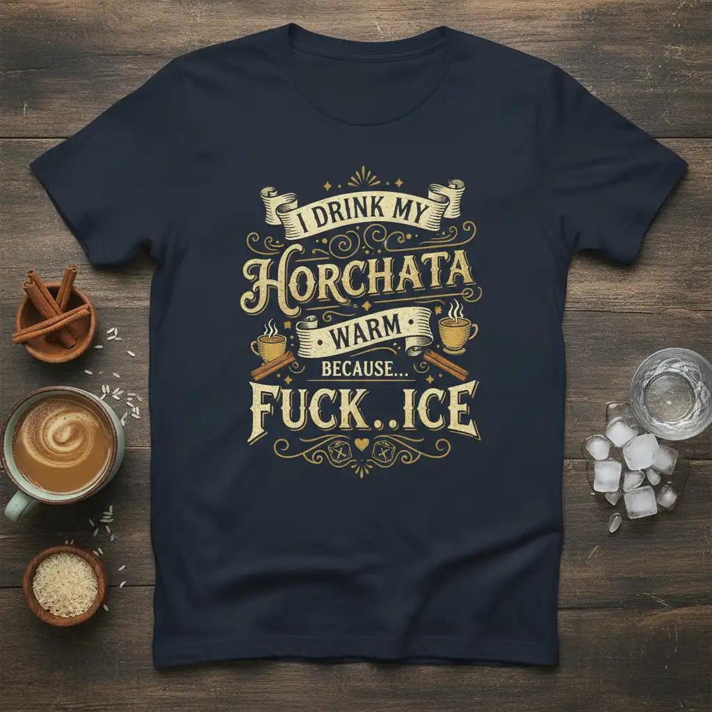 This t-shirt is designed for the true horchata aficionado who understands that warmth is key. The phrase “I Drink My Horchata Warm Because Fuck Ice” is emblazoned across the chest in a stylized, vintage-inspired font. It’s a humorous and direct way to communicate your preferred way to enjoy this beloved drink. The design is detailed with ornate banners, charming coffee cup graphics, and subtle cinnamon stick accents, evoking the comforting essence of horchata.