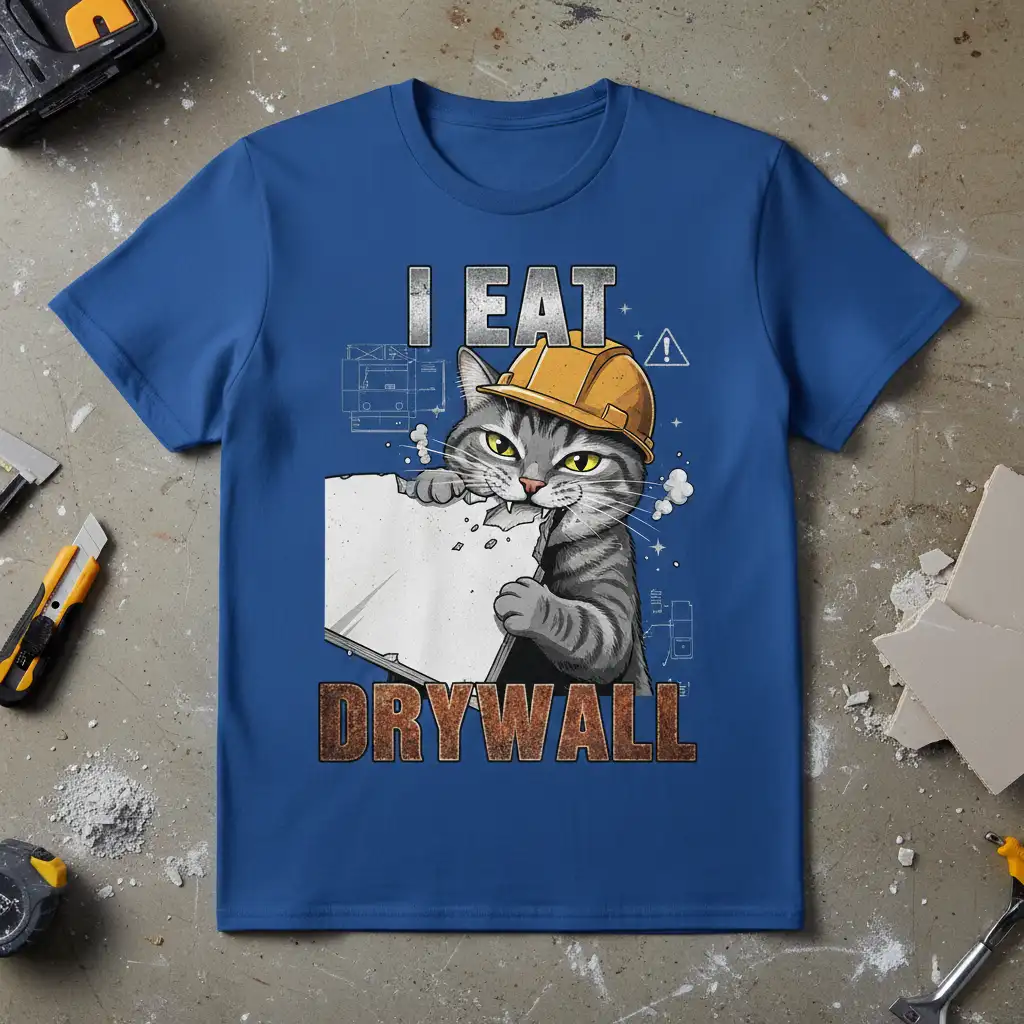 I Eat Drywall – this bold statement t-shirt is designed for those who appreciate a good laugh and a bit of hard work. It features a determined cat, sporting a hard hat, mid-chew on a piece of drywall, surrounded by construction blueprints. This design perfectly captures the spirit of construction professionals, DIY enthusiasts, and anyone who finds humor in the building process. It’s more than just a shirt; it’s a declaration of dedication, albeit a comically exaggerated one. The intricate details in the graphics, from the cat’s intense gaze to the background schematics, make this tee a standout piece for any wardrobe.