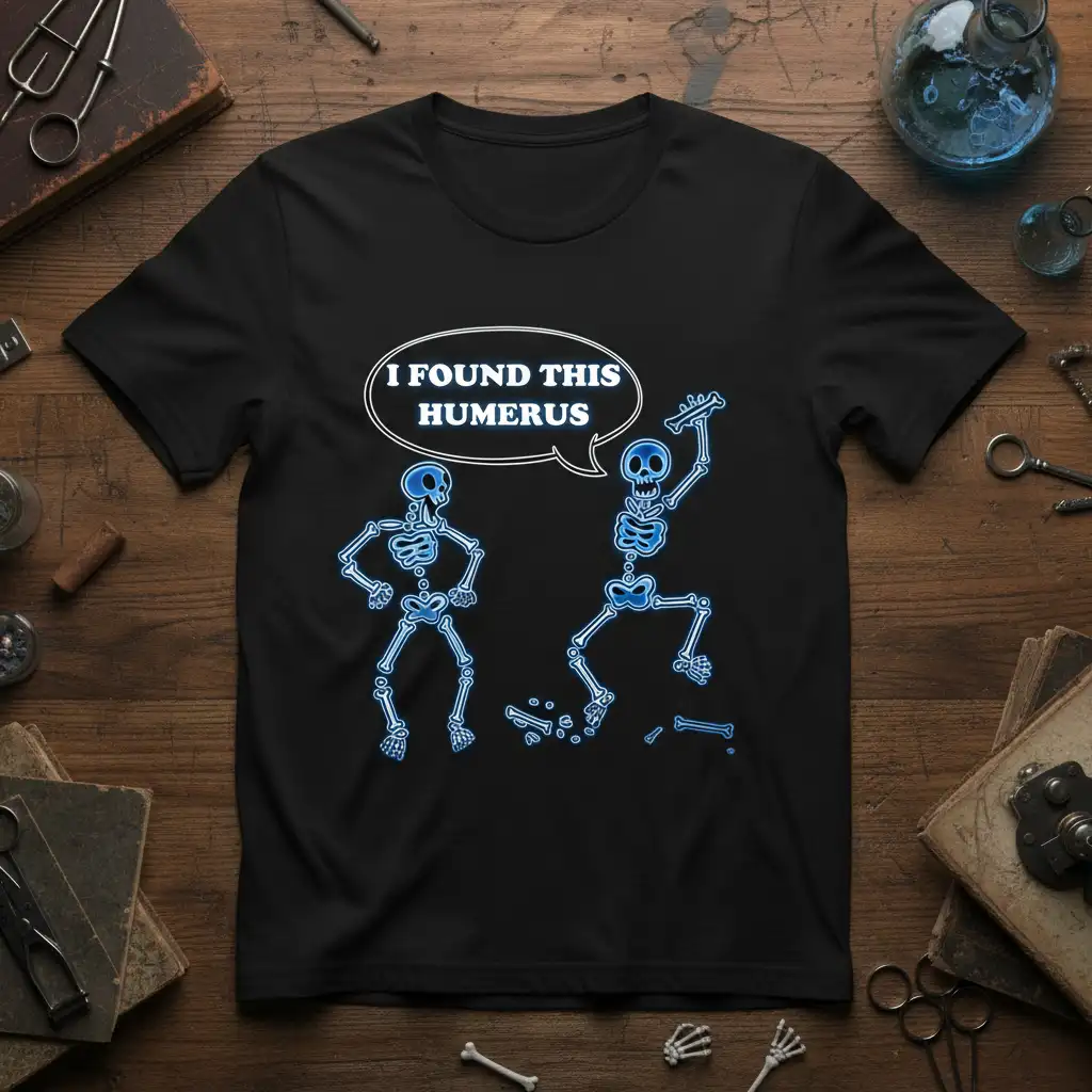 I FOUND THIS HUMERUS. This hilarious t-shirt is designed to bring a smile to your face and spark conversations. It’s the perfect way to showcase your appreciation for clever wordplay and anatomical humor. Whether you’re a science enthusiast, a medical professional, or just someone who loves a good pun, this shirt is a fantastic addition to your collection. Get ready to share some laughs and spread some scientific cheer.