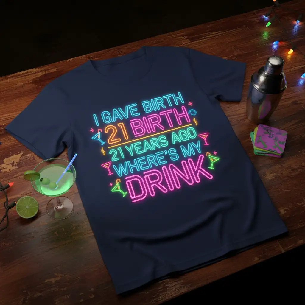 I GAVE BIRTH 21 BIRTH 21 YEARS AGO WHERE’S MY DRINK is more than just a phrase; it’s a declaration of independence and a humorous nod to reaching a significant milestone. This t-shirt is designed for those who appreciate a good laugh and want to celebrate their 21st birthday with a statement piece. It captures the essence of finally being able to legally enjoy a drink after years of anticipation. The vibrant, neon-inspired design adds a festive flair, making it perfect for any birthday party, bar hopping adventure, or casual get-together. Get ready to turn heads and spark conversations with this unique and witty apparel.