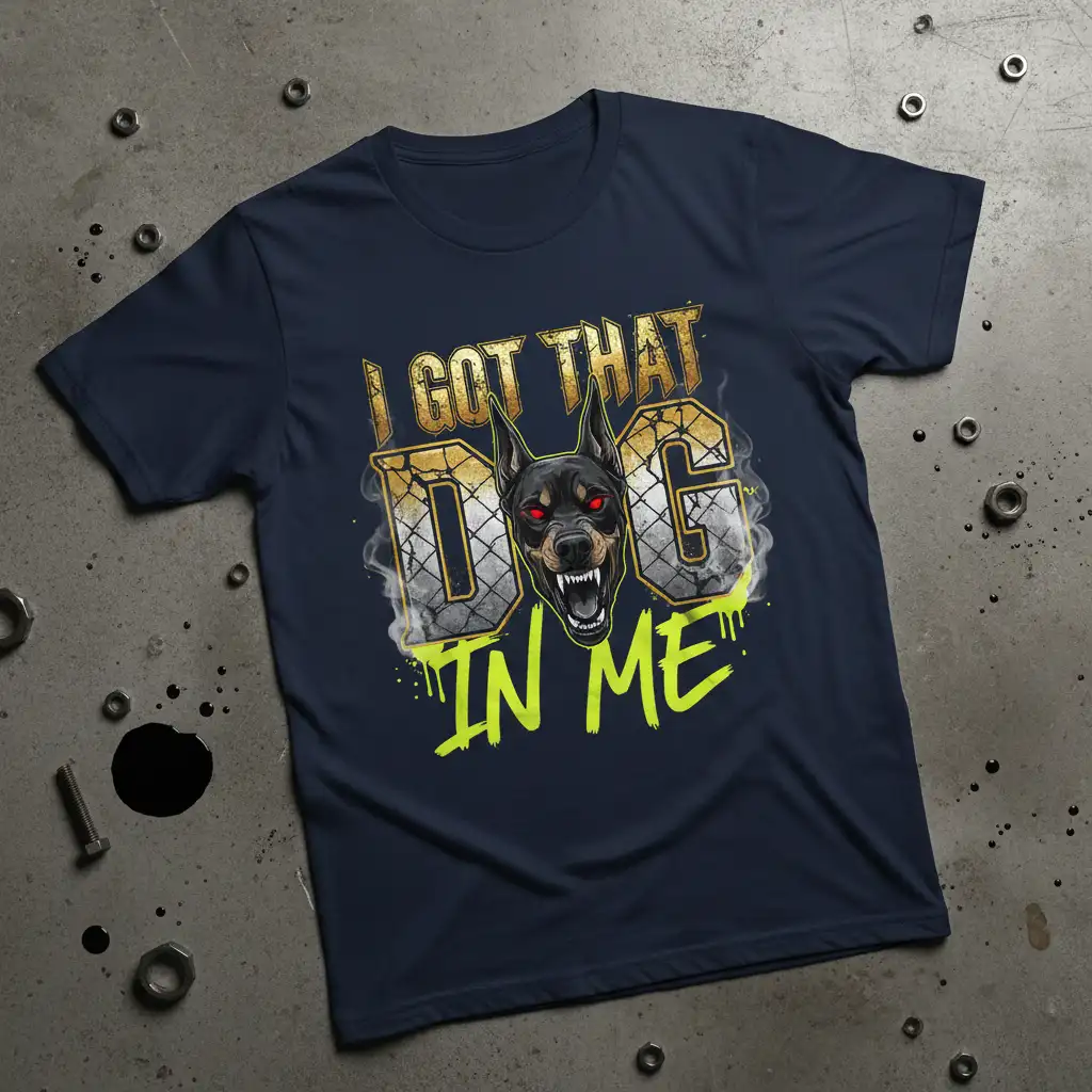 This I GOT THAT DOG IN ME design is rendered with a gritty, urban aesthetic, featuring distressed gold lettering for “I GOT THAT” and “IN ME,” contrasted with a vibrant, almost electric lime green for “DOG.” The Doberman’s head is central, complete with piercing red eyes and a snarling expression, surrounded by wisps of smoke and a chain-link fence texture. This combination creates a visually arresting piece that demands attention and conveys a strong personality.