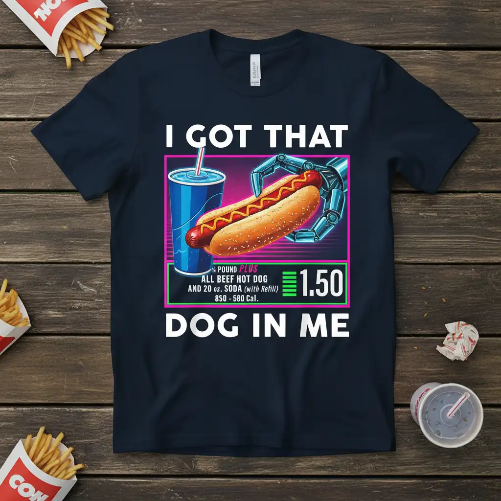 I Got That Dog In Me, this tee perfectly captures the spirit of a true hot dog connoisseur. Featuring a vibrant, retro-inspired design reminiscent of classic 80s diners, this shirt is a conversation starter for any food lover. It’s more than just apparel; it’s a declaration of your passion for the iconic combination of a juicy hot dog and a refreshing soda. The detailed graphic includes a price and calorie count, adding an authentic vintage touch that fans of retro aesthetics will adore.