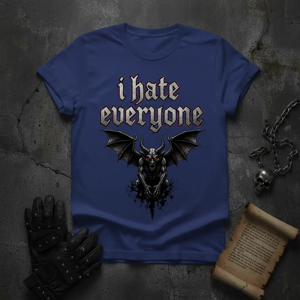 Pick from Black, Navy, Royal, Dark Heather, Red, and White to match your mood and wardrobe staples. Each colorway keeps the i hate everyone design clear and photo-ready for everyday wear.