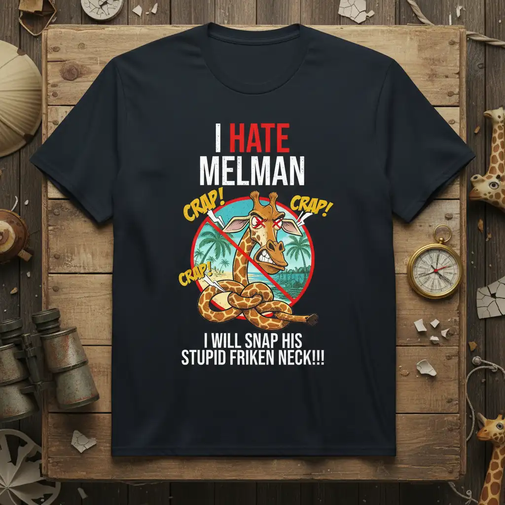 I HATE MELMAN CRAP! CRAP! CRAP! I WILL SNAP HIS STUPID FRIKEN NECK!!! This eye-catching t-shirt design is not for the faint of heart, boldly declaring a humorous frustration with a character named Melman. Featuring a comically enraged giraffe, this apparel is perfect for anyone who appreciates a good laugh and doesn’t shy away from expressing their feelings. The vibrant graphics and strong typography ensure this design stands out, making it an ideal conversation starter or a memorable gift for friends with a similar sense of humor. It’s more than just a shirt; it’s a wearable declaration of playful exasperation.