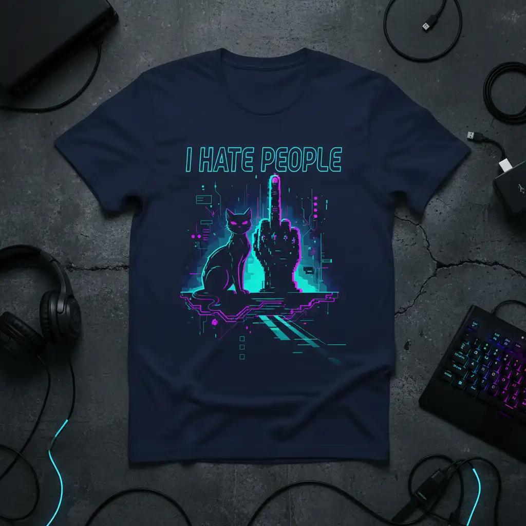 This striking graphic tee features the unmistakable phrase “I HATE PEOPLE” emblazoned across the top in a vibrant, neon-inspired font. Below the text, a sleek, stylized cyberpunk cat sits confidently, gazing forward with glowing eyes. The design is completed by a pixelated, digital rendition of the middle finger, adding a layer of rebellious humor and attitude to the overall composition. The intricate circuitry and futuristic elements woven throughout the artwork create a captivating visual experience that speaks to fans of dark humor and unique, edgy styles.