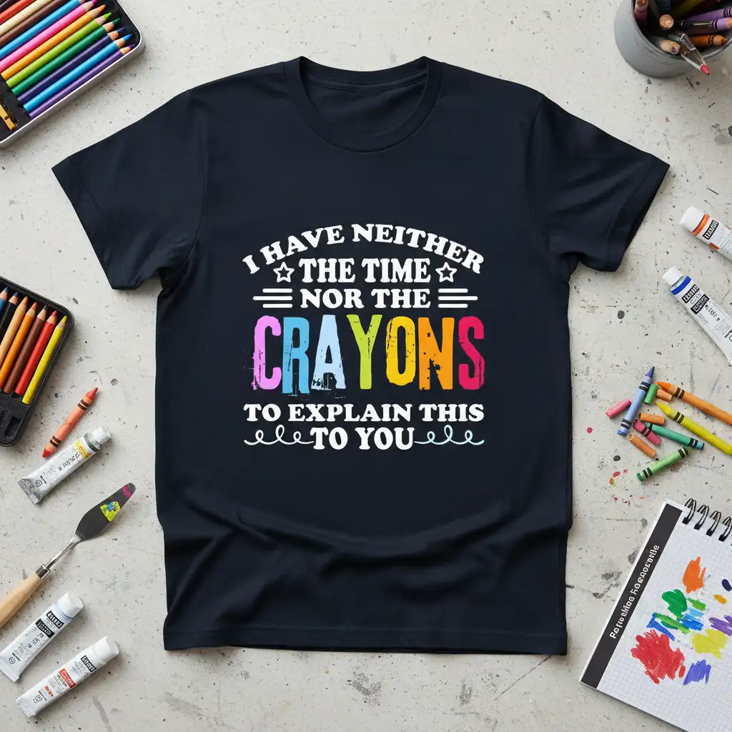 The vibrant, multi-colored “CRAYONS” text pops against the dark fabric, symbolizing the limited resources of time and energy that often accompany a demanding schedule. It’s a clever way to express that you’ve reached your capacity for detailed explanations, making it a relatable piece for anyone in a high-demand role.