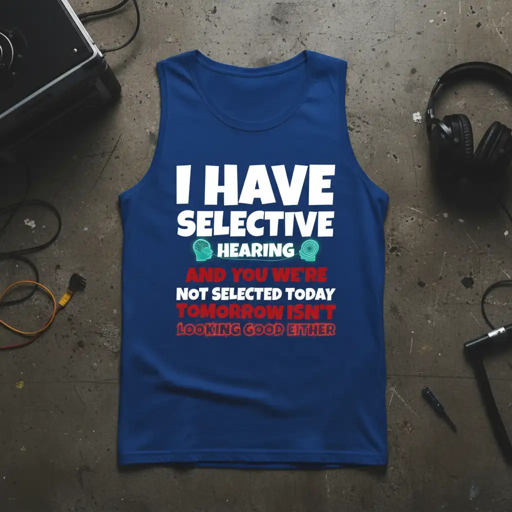 I HAVE SELECTIVE HEARING AND YOU WE’RE NOT SELECTED TODAY TOMORROW ISN’T LOOKING GOOD EITHER. This statement tank top is designed for those who possess a keen sense of humor and a unique perspective on communication. It’s more than just apparel; it’s a declaration of wit, perfect for anyone who enjoys a good laugh and isn’t afraid to express themselves. The bold typography ensures your message is seen and understood, making it an ideal choice for casual outings or social gatherings. Stand out from the crowd with this undeniably clever piece.