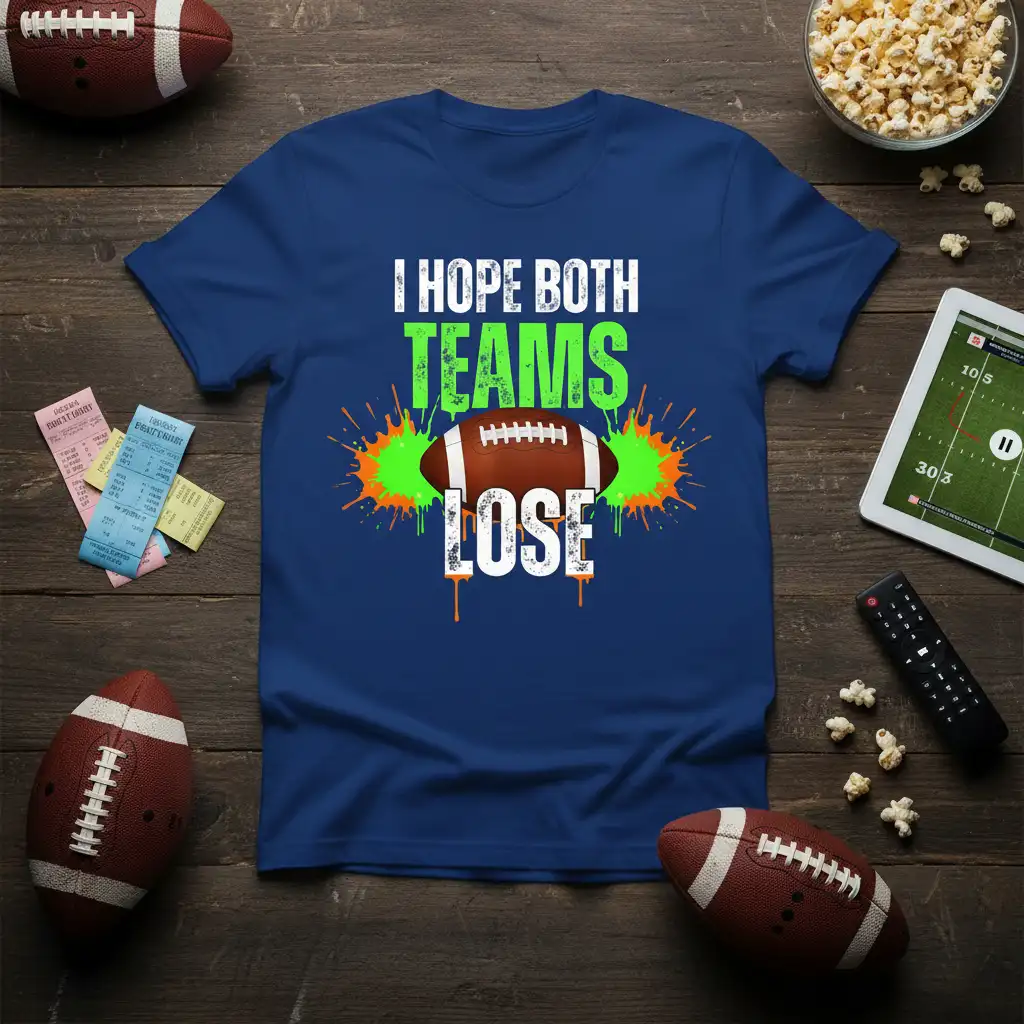 Whether you’re heading to a live game, watching with friends at a sports bar, or enjoying a cozy night in, this “I Hope Both Teams Lose” t-shirt ensures you’re dressed for the occasion. Its comfortable fit and durable print make it ideal for any setting where football is the main event. It’s the perfect gear for those who love the sport but prefer to stay above the fray of team loyalties.