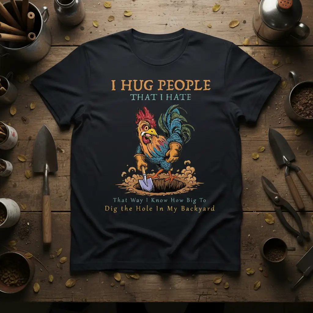 This eye-catching t-shirt features a vibrant and comical illustration of a rooster enthusiastically digging a rather large hole. The accompanying text, “I HUG PEOPLE THAT I HATE,” sets a playful, sarcastic tone, while the second line, “THAT WAY I KNOW HOW BIG TO Dig the Hole In My Backyard,” adds a clever punchline. This combination makes the shirt a fantastic choice for those who enjoy humor with a touch of the absurd, especially if they have a passion for gardening or farm life.