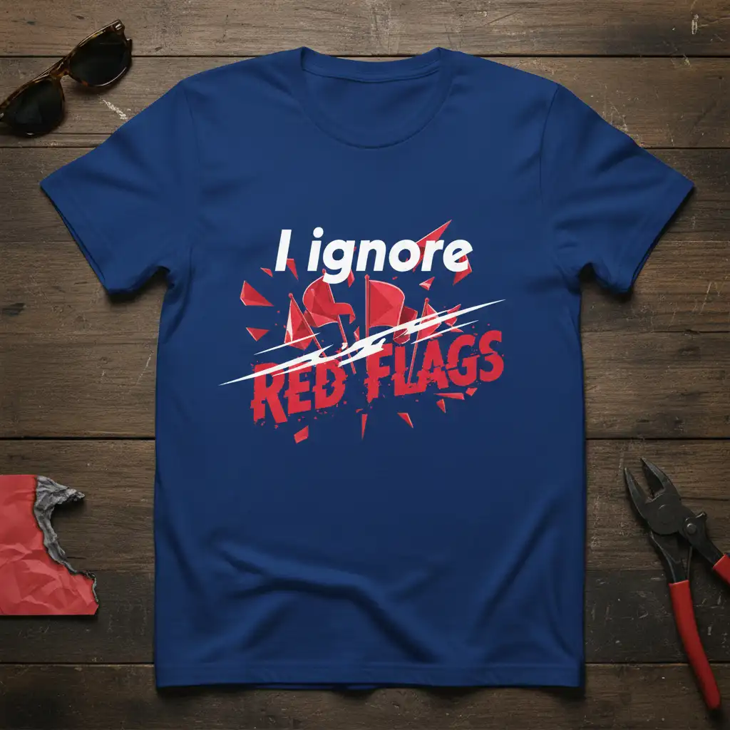 I ignore RED FLAGS boldly emblazoned across this t-shirt captures a spirit of playful defiance and ironic humor. This design is perfect for anyone who enjoys a sarcastic statement or a witty remark, making it a standout piece in any casual wardrobe. It’s more than just clothing; it’s a declaration of a certain kind of carefree attitude, presented with striking visual flair. Get ready to turn heads and spark conversations with this unique and memorable graphic tee.