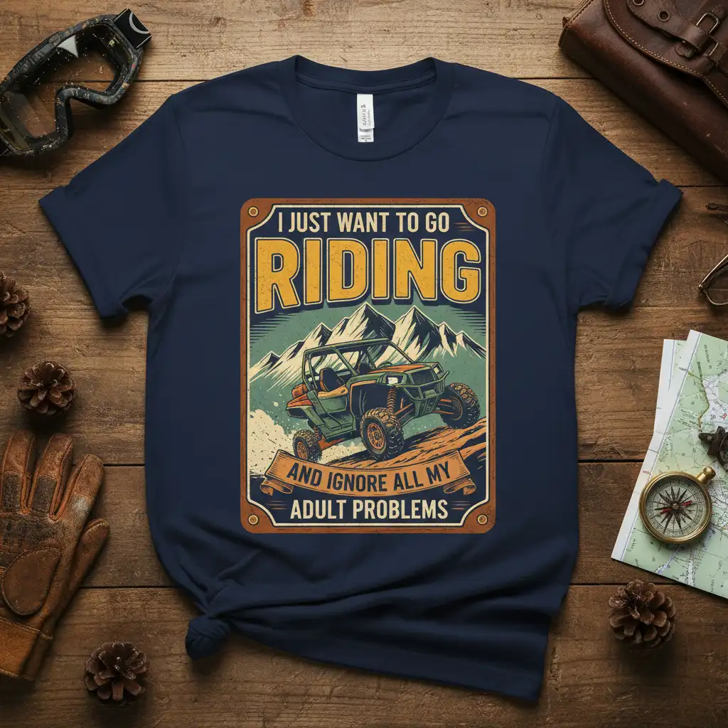 The “I Just Want To Go Riding” t-shirt is crafted for the spirit of adventure that calls to outdoor enthusiasts. It features a striking graphic of a UTV tackling a challenging mountain path, symbolizing the freedom and exhilaration of off-road exploration. This design is a direct invitation to escape the mundane and immerse yourself in nature’s playground. It’s ideal for anyone who believes that the best way to deal with adult problems is to simply go riding.