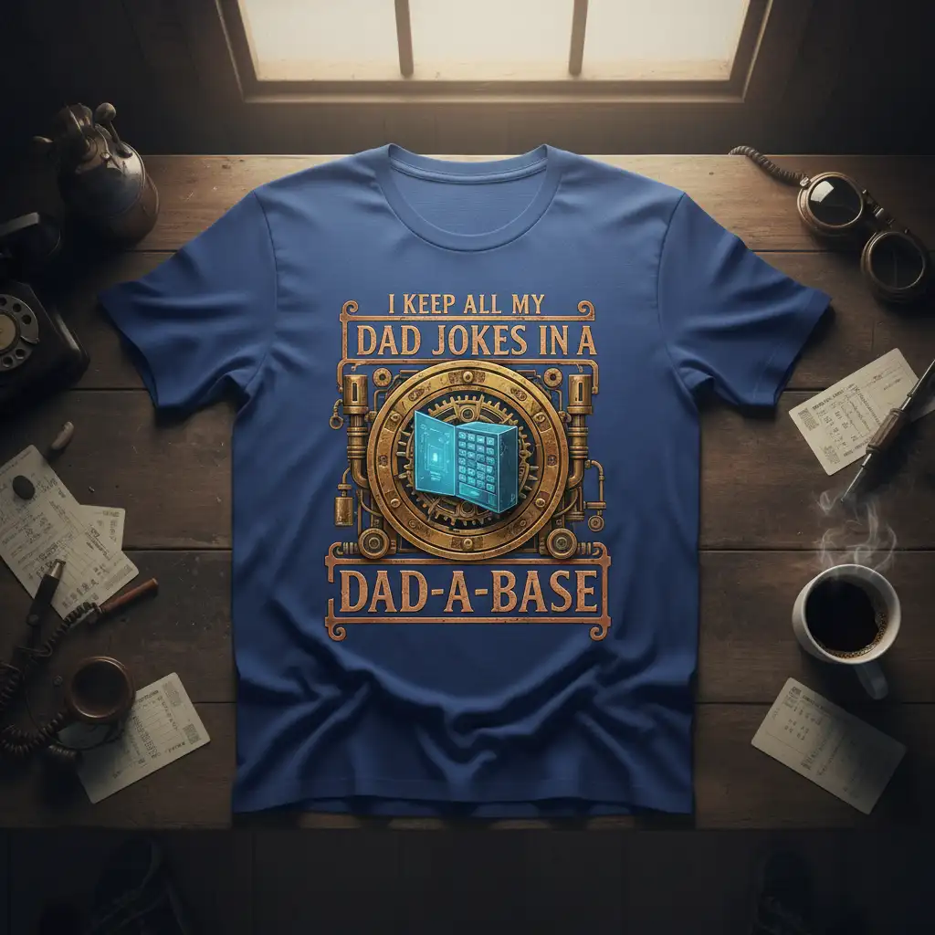 This t-shirt proudly proclaims that all those classic dad jokes are stored securely in a “DAD-A-BASE,” a clever play on words that resonates with anyone who has experienced the delightful cringe of a well-timed dad pun. The design features a bold, eye-catching graphic that blends the concept of a database with a vintage, steampunk aesthetic, complete with intricate gears and metallic accents. It’s a visual representation of a dad’s endless well of humor, ready to be accessed and shared.