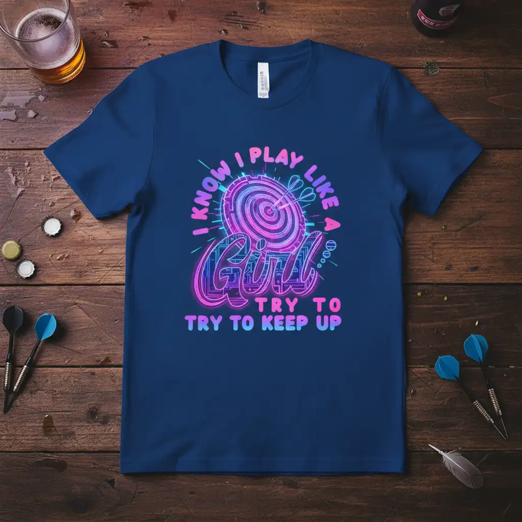 I KNOW I PLAY LIKE A GIRL TRY TO TRY TO KEEP UP, this statement t-shirt is designed for the fierce and fabulous female darts player who commands respect on the oche. It’s more than just apparel; it’s a declaration of skill, confidence, and the undeniable fact that you play to win. The vibrant, neon-inspired design captures the electrifying energy of the game, making it a perfect conversation starter and a proud display of your passion. Whether you’re a seasoned pro or just starting your darting journey, this tee lets everyone know you’re here to compete and conquer.