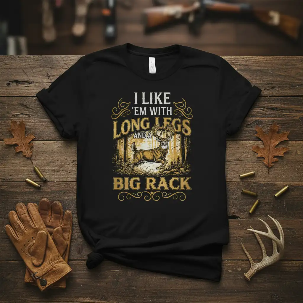 I Like ‘Em With Long Legs And A Big Rack — this bold statement t-shirt is designed for the passionate hunter and outdoors enthusiast. It perfectly captures the excitement and challenge of the hunt with a humorous and eye-catching graphic. Crafted for comfort and durability, this tee is ideal for wearing during your next hunting trip or casual outings. Express your love for wildlife and the thrill of the chase with a design that speaks to fellow adventurers.