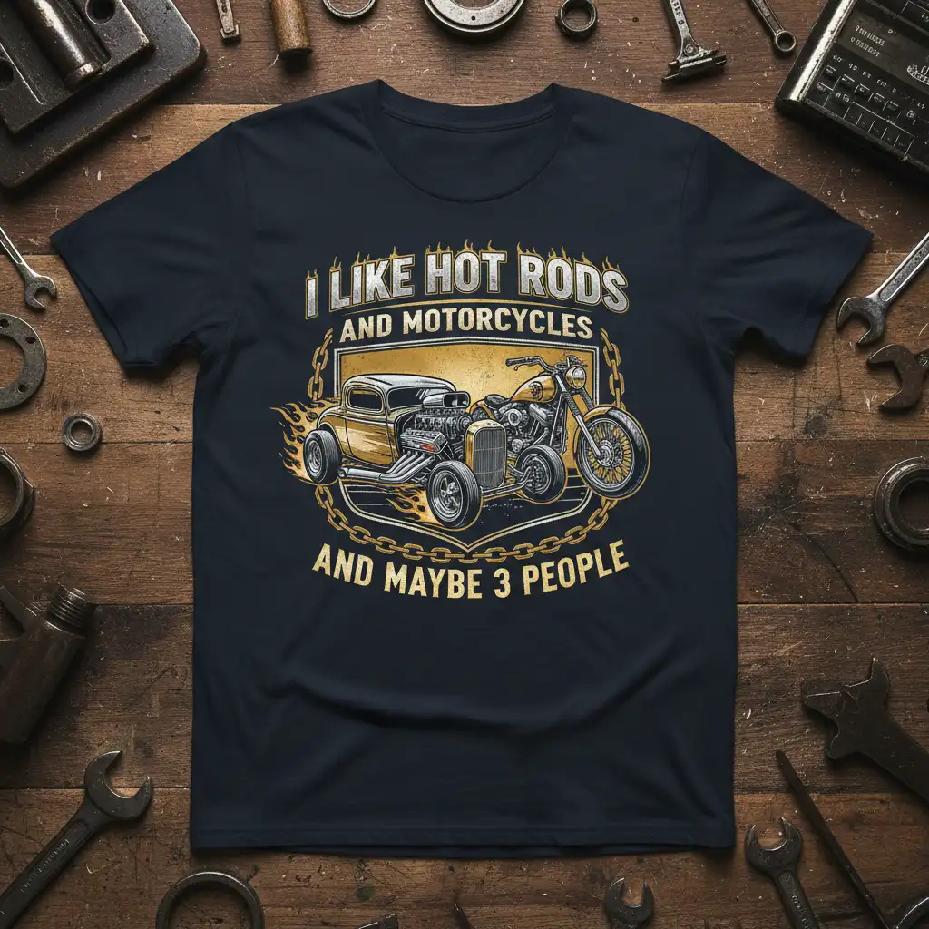 I LIKE HOT RODS AND MOTORCYCLES AND MAYBE 3 PEOPLE, this statement tee perfectly captures the spirit of true enthusiasts who understand that some passions are just more important than others. It’s more than just a t-shirt; it’s a declaration of your core interests, blending a love for classic automotive engineering with the freedom of two-wheeled adventure. The bold design and witty text make it a fantastic conversation starter at car shows, bike rallies, or casual hangouts. It’s the ideal way to express your unique personality and connect with like-minded individuals who share your appreciation for powerful engines and iconic designs.