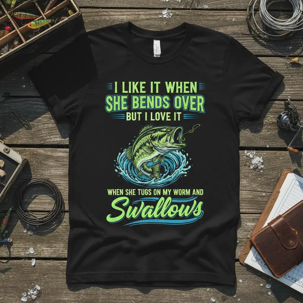I Like It When She Bends Over But I Love It When She Tugs On My Worm And Swallows, this t-shirt is designed for the dedicated angler who appreciates a good sense of humor and the thrill of the catch. The bold text and dynamic fish graphic capture the essence of a passionate fisherman’s life. It’s more than just apparel; it’s a statement piece that resonates with anyone who understands the dedication and joy that comes with a day spent out on the water. This shirt is perfect for gifting to the fisherman in your life or treating yourself to a piece that truly reflects your hobby.