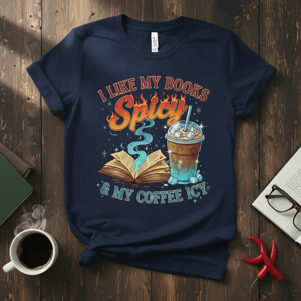 The concept behind “this design” speaks to the contrasting yet complementary pleasures in life. Spicy books offer excitement, intrigue, and emotional depth, much like a bold flavor. Icy coffee, on the other hand, provides a cool, smooth, and revitalizing experience, a perfect balance to the intensity of a great read. This t-shirt is designed for those who appreciate both the thrill of a good story and the refreshing calm of a cold beverage.