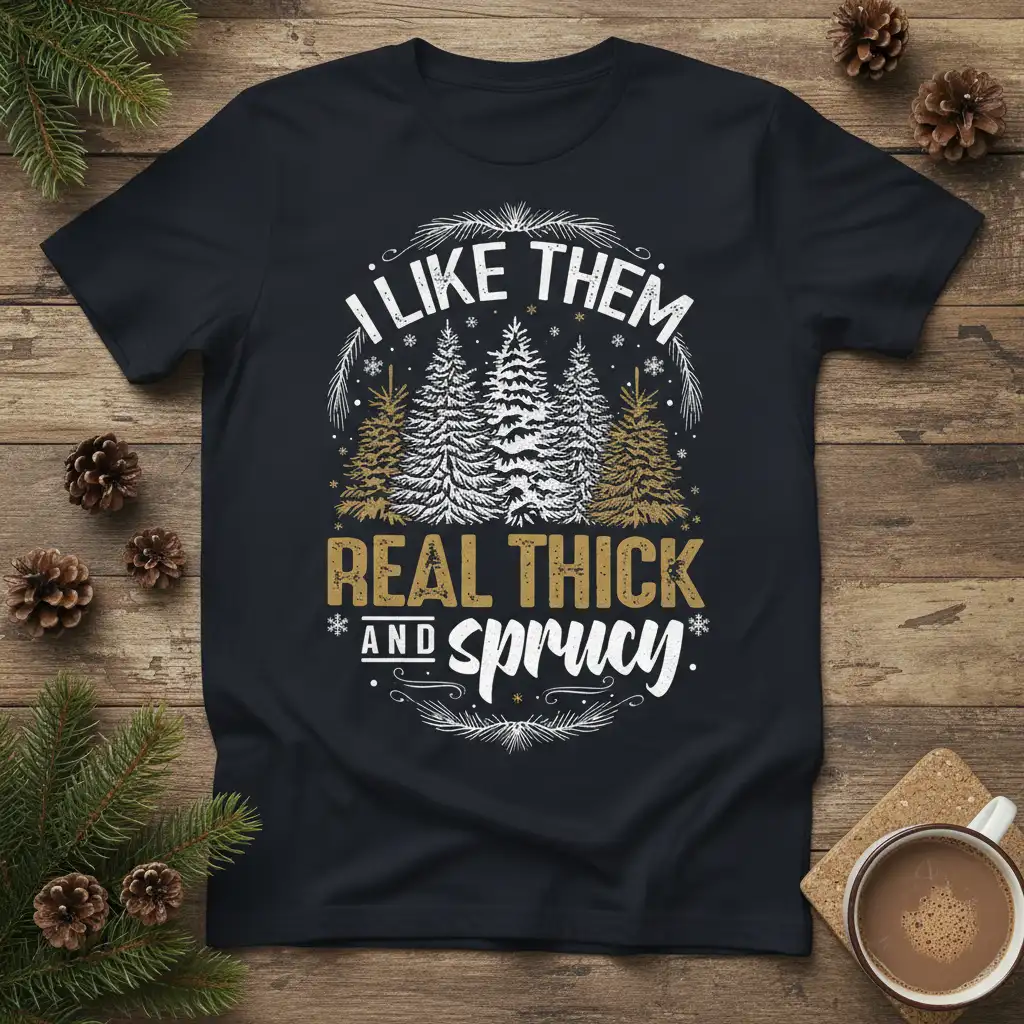 I Like Them Real Thick And Sprucy, this phrase perfectly captures the fun and playful spirit of the holiday season. This t-shirt is designed to bring smiles and laughter to any festive gathering, embodying the joy and lightheartedness that makes winter celebrations so special. It’s more than just apparel; it’s a statement piece that celebrates the unique charm of the holidays and the appreciation for all things wonderfully wintery. Get ready to spread some festive cheer and embrace the season with this uniquely designed tee.