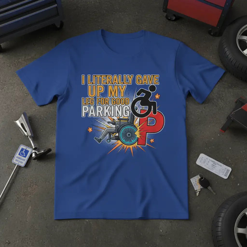 I LITERALLY GAVE UP MY LEG FOR GOOD PARKING. This t-shirt is a bold, humorous, and empowering statement piece designed for those who understand the unique challenges and triumphs associated with mobility aids and accessible spaces. It’s more than just apparel; it’s a conversation starter and a badge of honor, celebrating resilience and wit within the disability community. Perfect for everyday wear, this tee brings a touch of lightheartedness to important discussions about accessibility and inclusion. Show your pride and share a laugh with this thoughtfully designed graphic. It’s a fantastic way to express your personality and connect with others who appreciate bold statements.