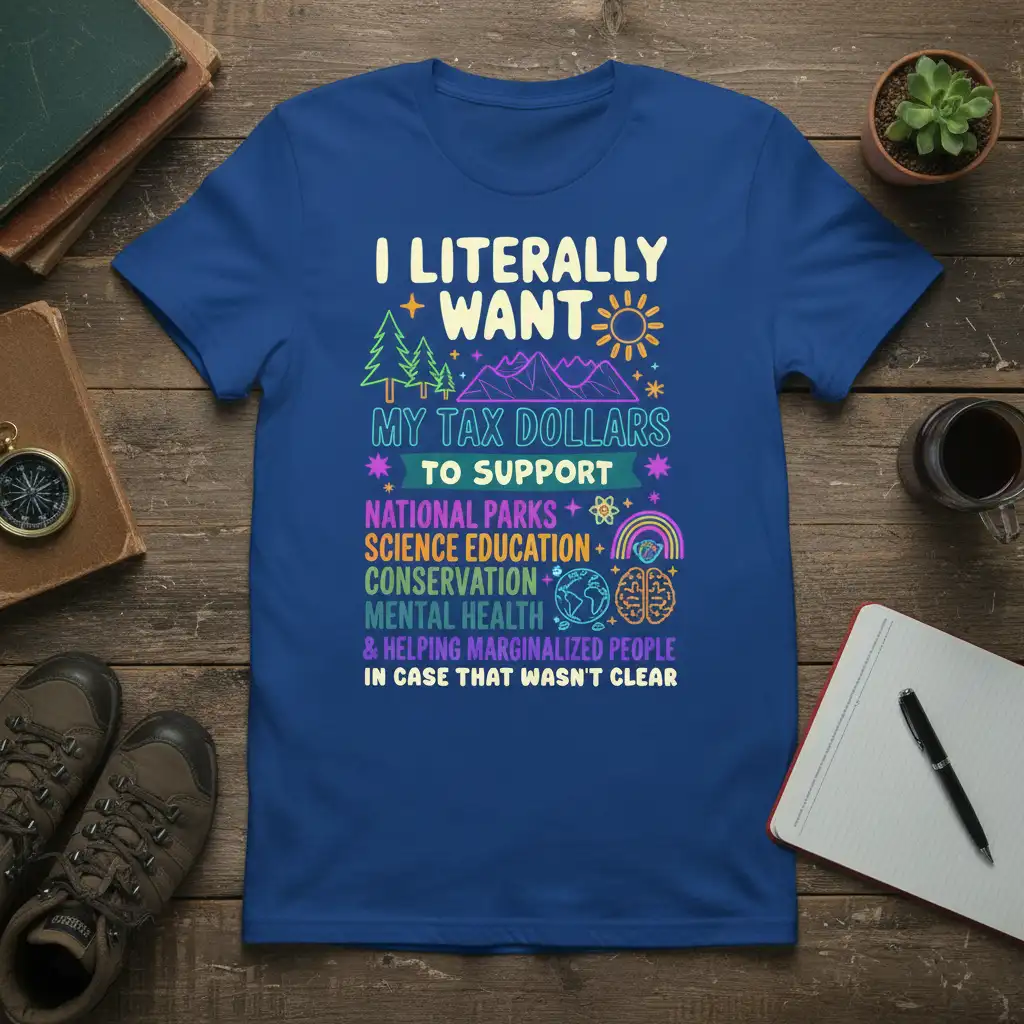 I LITERALLY WANT MY TAX DOLLARS TO SUPPORT NATIONAL PARKS SCIENCE EDUCATION CONSERVATION MENTAL HEALTH & HELPING MARGINALIZED PEOPLE IN CASE THAT WASN’T CLEAR on this comfortable and conversation-starting t-shirt. This design is perfect for anyone who believes in investing in our planet, our minds, and our communities. It’s more than just apparel; it’s a statement of priorities and a call for thoughtful resource allocation. Express your commitment to a better future by wearing your values proudly.
