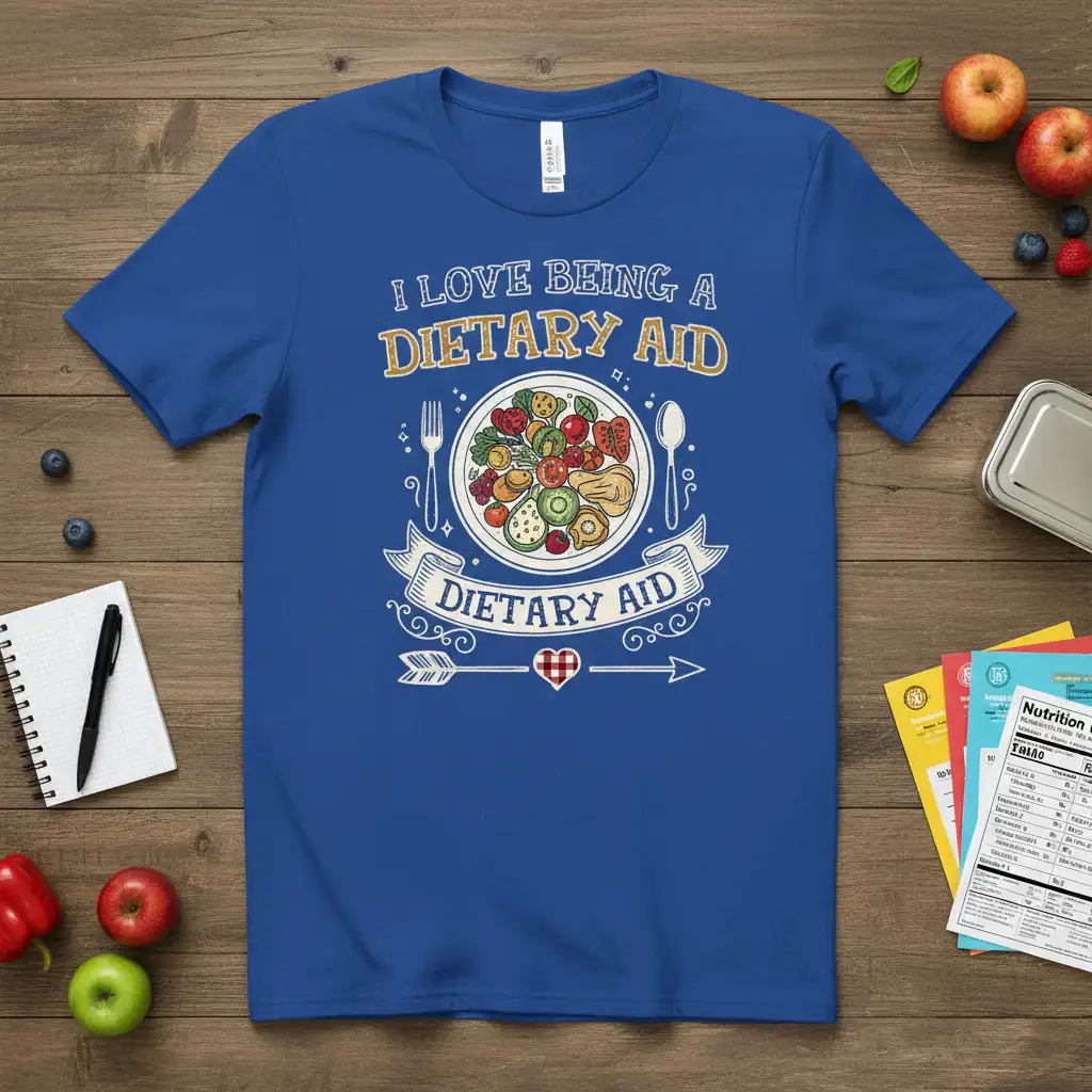 This t-shirt proudly displays “I LOVE BEING A DIETARY AID” in a distinctive font, accompanied by a visually appealing illustration of a healthy meal. The plate is brimming with a colorful assortment of fresh fruits, vegetables, and protein, symbolizing the importance of balanced nutrition. It’s a constant reminder of the positive impact dietary aids have on the lives of others, fostering healthier habits and better outcomes.