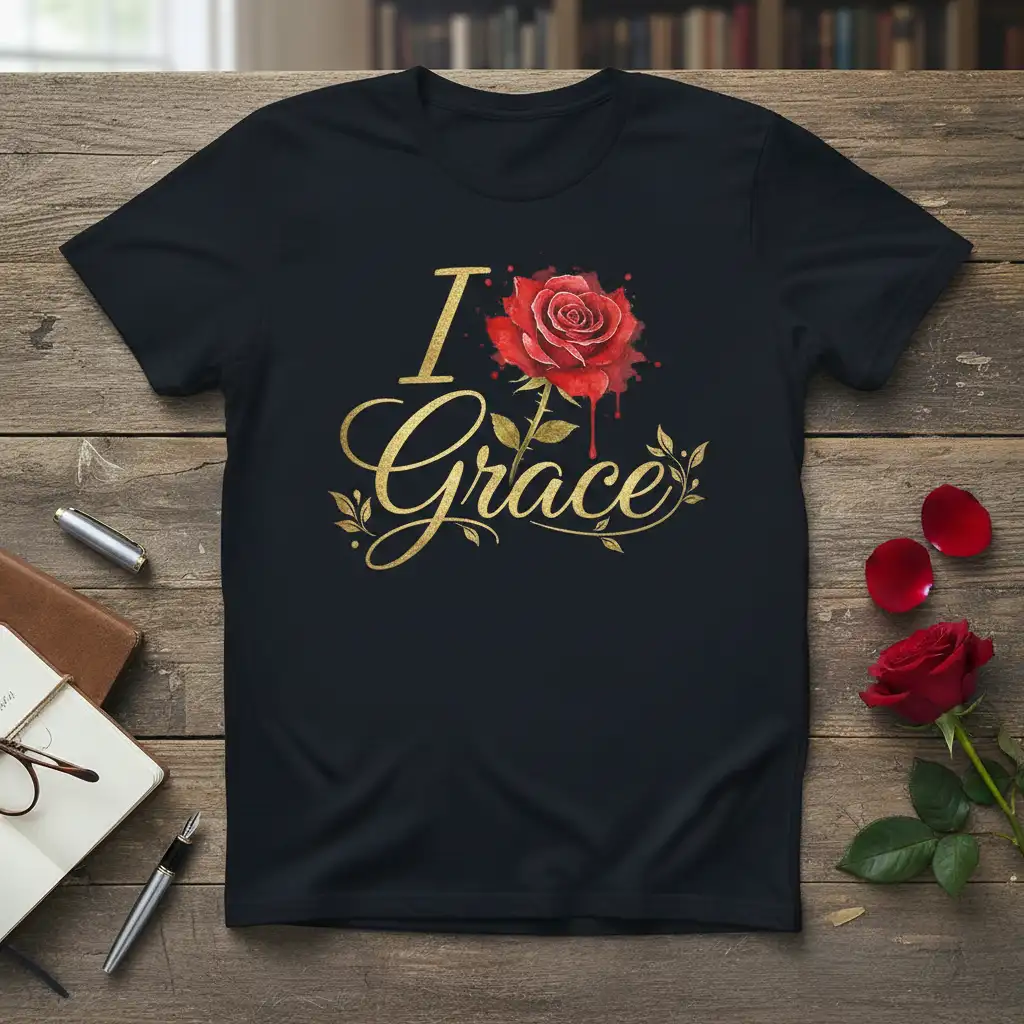 This captivating t-shirt celebrates the profound meaning of grace through its artistic presentation. The central design features a vividly rendered red rose, its petals exuding a sense of life and vibrancy, accented by a watercolor effect that adds depth and texture. Encircling this floral emblem is the word “Grace” written in a flowing, luxurious gold script, evoking a sense of elegance and divine beauty. The “I” is positioned above, completing the heartfelt message of devotion.