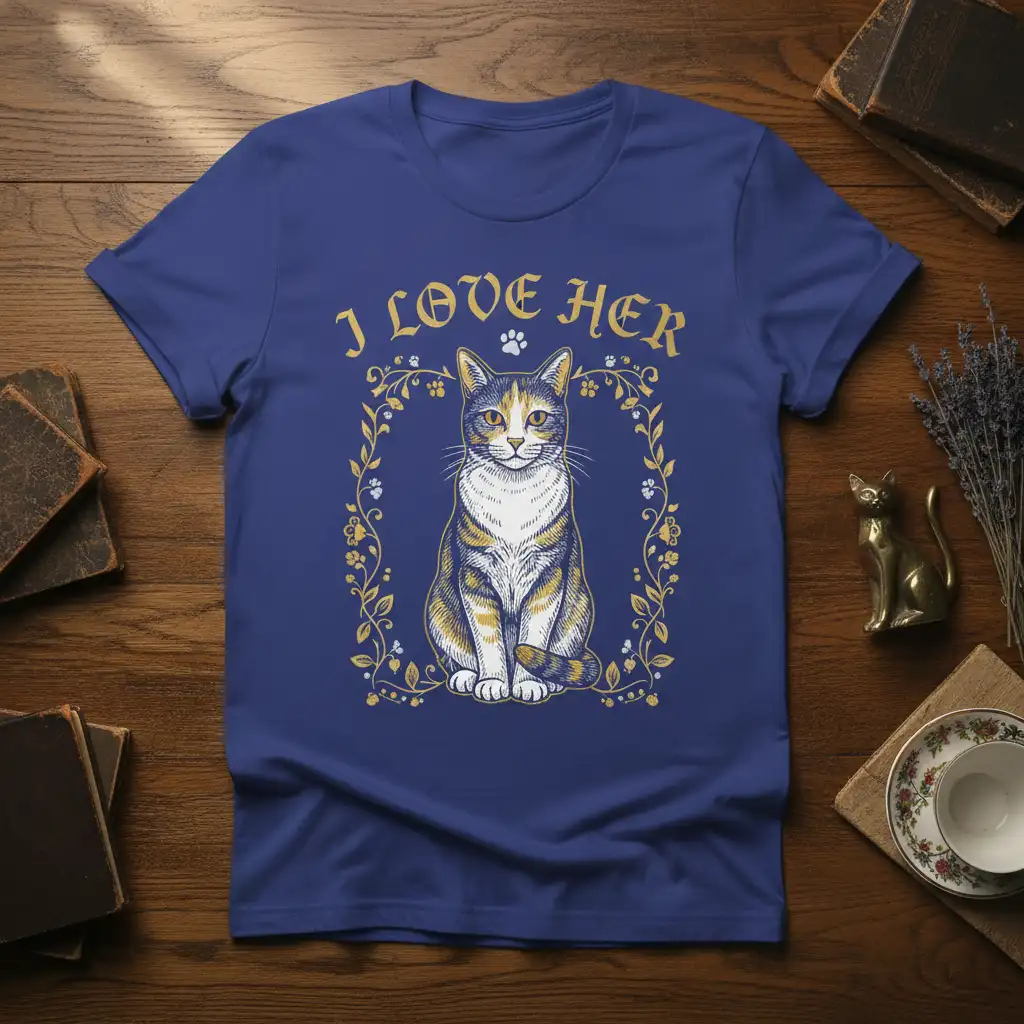 The phrase “I LOVE HER” is elegantly presented in a vintage-inspired font, adding a touch of classic charm to the overall design. This tee is crafted for comfort and style, ensuring you look and feel great while showing off your love for cats. It’s an ideal choice for casual outings, lounging at home, or as a thoughtful gift for fellow cat lovers.