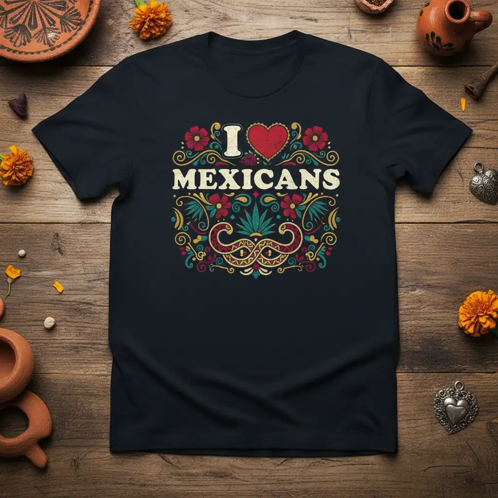 This I Love Mexicans design is a testament to the beauty and resilience of Mexican culture, using a color palette that is both festive and timeless. Each element has been carefully chosen to represent the warmth, passion, and rich history associated with Mexico. This t-shirt serves as a wearable piece of art that tells a story of heritage and belonging.