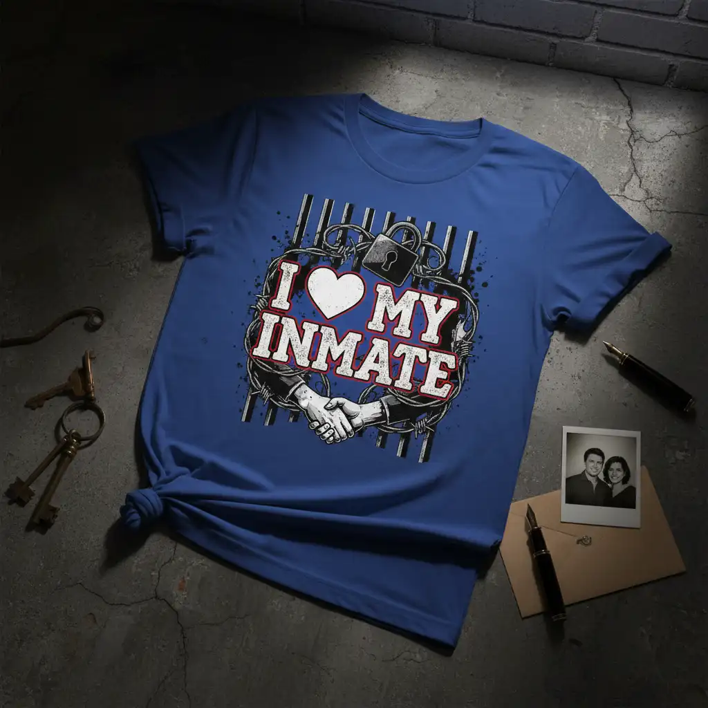 This distinctive design features the powerful declaration “I ❤️ MY INMATE,” symbolizing a profound connection that transcends physical separation. The graphic elements, including barbed wire, a lock, and prison bars, are artfully integrated to represent the circumstances while emphasizing the strength of the bond. The inclusion of shaking hands further reinforces themes of unity, partnership, and mutual support. It’s a design that resonates deeply with those who understand the complexities and unwavering nature of love in such situations.