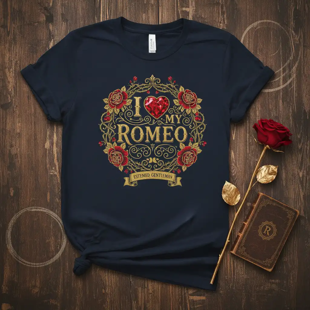 This unique t-shirt showcases a captivating circular design. At its center, a brilliant red heart, reminiscent of a precious gem, symbolizes the depth of your love. Surrounding the heart is the prominent text “I LOVE MY ROMEO,” rendered in an elegant, decorative font that exudes charm and romance. The entire motif is framed by an exquisite wreath of deep red roses and intricate gold filigree, adding a touch of vintage luxury.