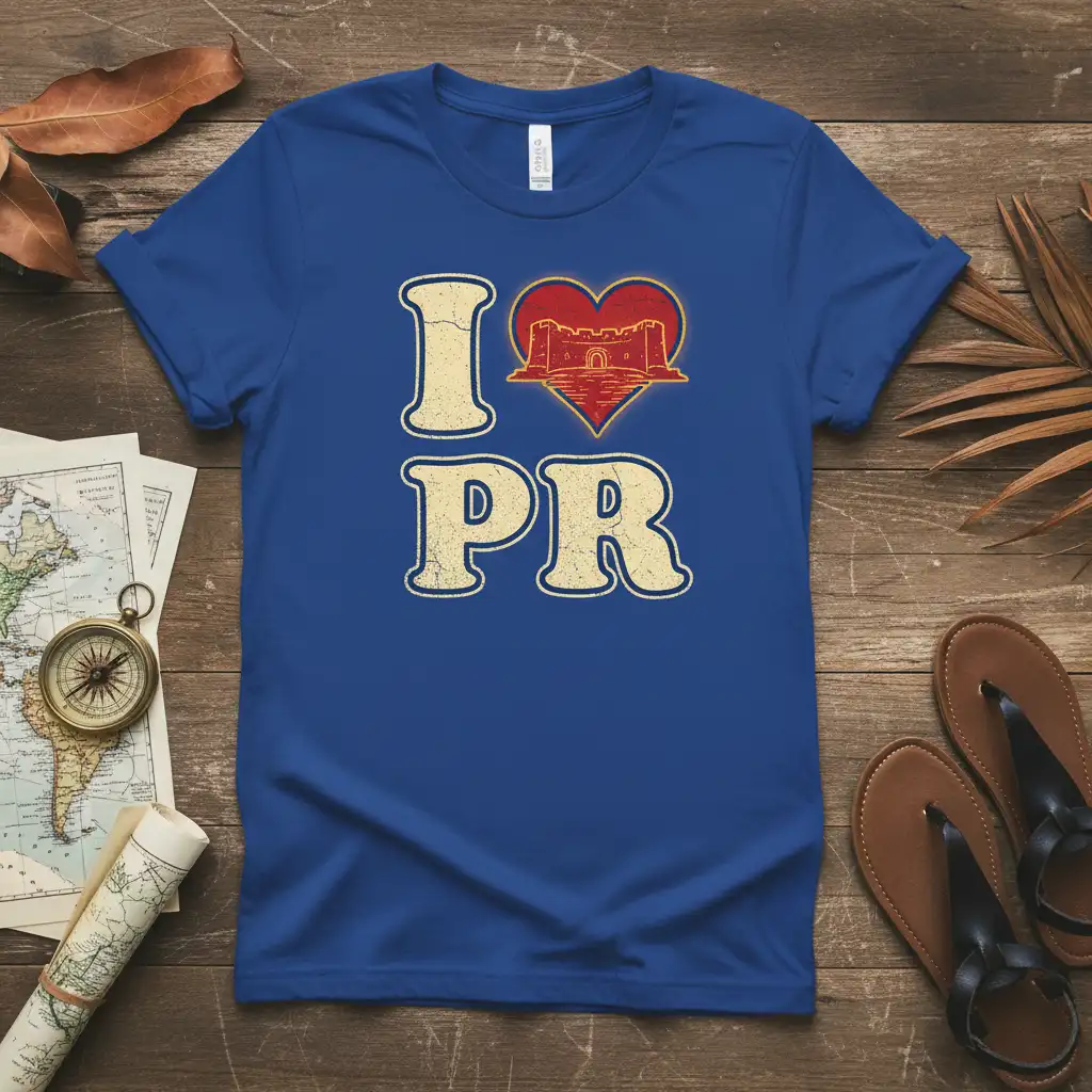 This “I Love PR” t-shirt captures the essence of Puerto Rican spirit with its distinctive graphic. The prominent red heart, a universal symbol of love, is intricately designed to include a silhouette of a historic castle, reminiscent of the island’s rich colonial past and iconic landmarks like El Morro. This visual element adds depth and a touch of history to the design, making it a meaningful representation of Puerto Rico’s heritage. The distressed, vintage-style lettering for “I” and “PR” adds a unique charm and character, ensuring this shirt stands out.