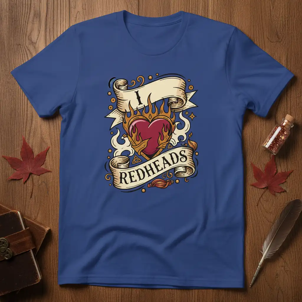 This eye-catching “I Love Redheads” t-shirt showcases a vibrant, tattoo-style heart at its center, dramatically surrounded by flames. The design is framed by classic banners, evoking a timeless tattoo aesthetic that is both bold and stylish. It’s crafted for those who want to proudly display their love for redheads and celebrate the unique allure of ginger hair. This tee serves as a fantastic conversation starter and a comfortable addition to any casual wardrobe.
