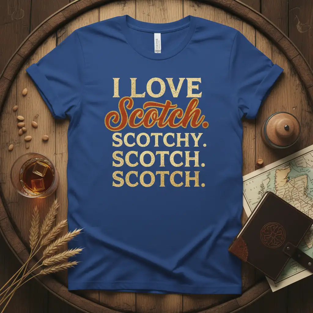 This I LOVE Scotch. SCOTCHY. SCOTCH. SCOTCH. design uses a combination of bold and script fonts, giving it a retro yet timeless appeal. This attention to detail ensures that the shirt not only communicates your message but also looks great. Whether you’re a seasoned scotch expert or just beginning to explore the world of fine spirits, this t-shirt is a perfect fit for your collection.