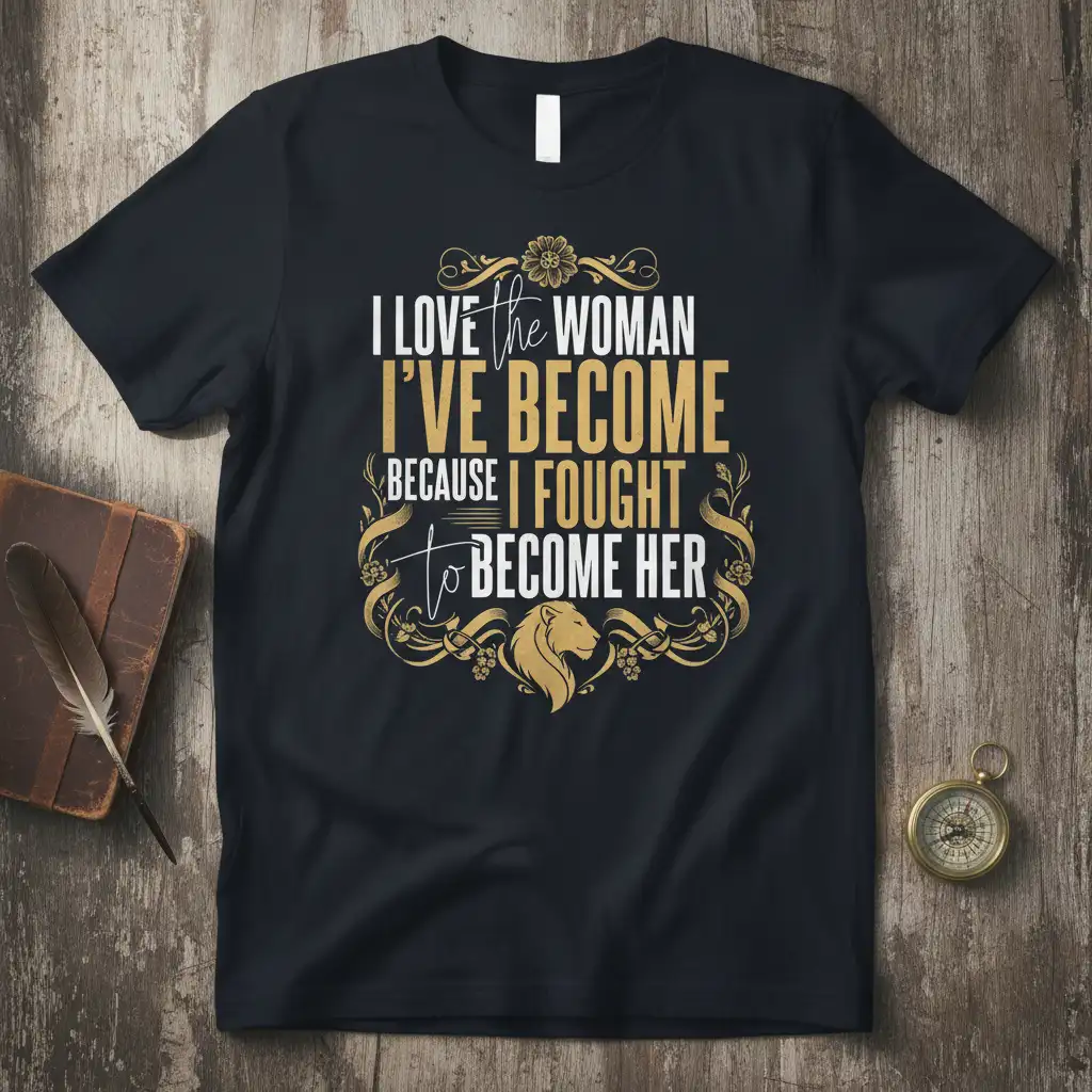 I LOVE the WOMAN I’VE BECOME BECAUSE I FOUGHT to BECOME HER is more than just a phrase; it’s a declaration of self-love, resilience, and the triumphant journey of personal transformation. This empowering t-shirt is designed for the woman who understands the value of her struggles and celebrates the strength she has cultivated along the way. It’s a wearable testament to the battles fought and the victories won in becoming the best version of herself. The intricate design, featuring elegant typography and a noble lion graphic, symbolizes inner fortitude and unwavering spirit. This tee serves as a constant reminder that the woman you are today is a product of your courage and perseverance.