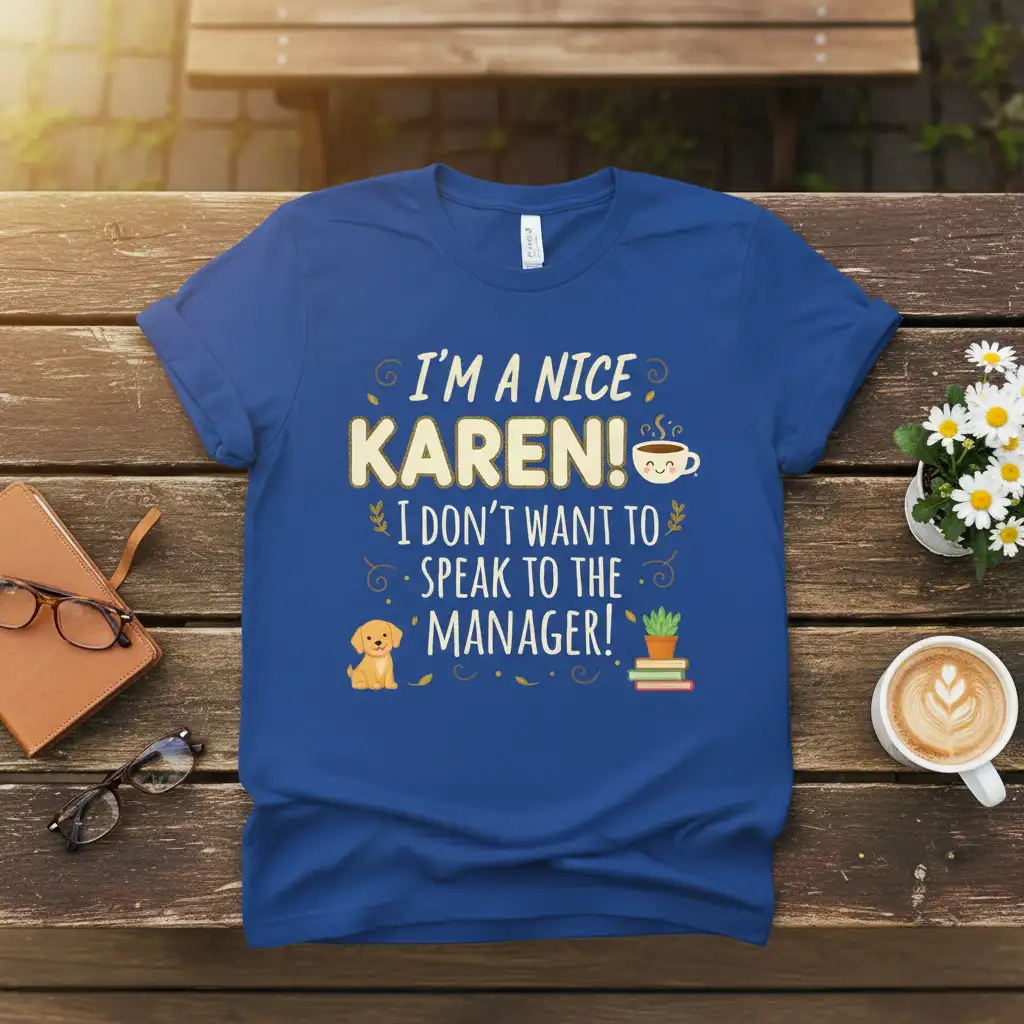 This unique graphic tee, featuring the memorable “I’m A Nice Karen! I Don’t Want To Speak To The Manager!” quote, is perfect for expressing your personality. It’s a lighthearted way to communicate your preferences and share a laugh. The design’s playful elements, like the smiling coffee cup and the friendly puppy, add an extra layer of charm, making it an irresistible choice for those who love witty and cute apparel.