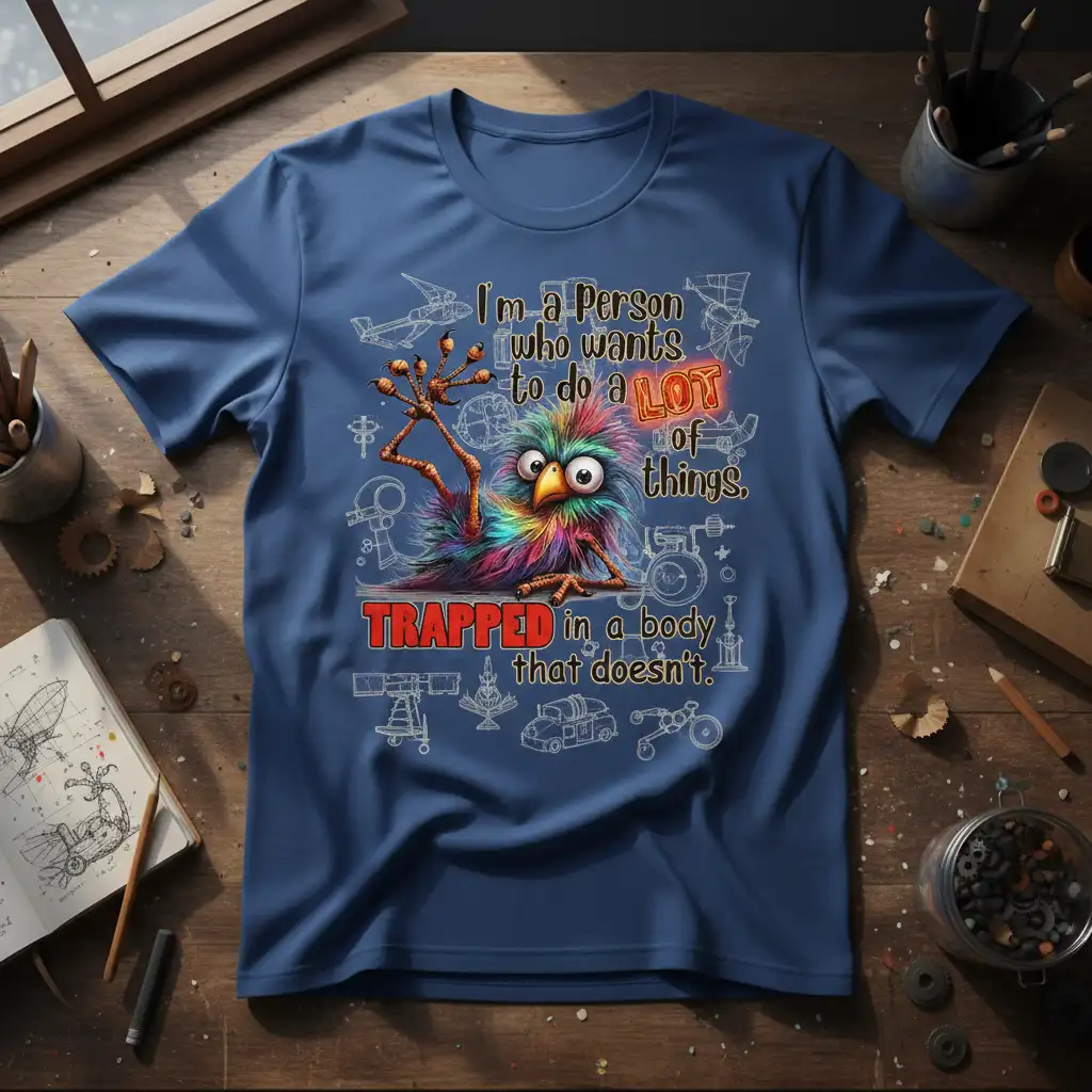 I’m a Person who wants to do a LOT of things. TRAPPED in a body that doesn’t. This unique t-shirt design speaks to the soul of dreamers, creators, and doers everywhere. It features a wonderfully whimsical, colorful bird that perfectly embodies the spirit of ambition and the occasional frustration of physical limitations. The design is not just a statement; it’s a relatable expression of having grand aspirations and a desire to accomplish them all, even when reality feels a bit restrictive. It’s perfect for anyone who feels they have a thousand ideas buzzing in their head and a universe of projects they want to tackle.
