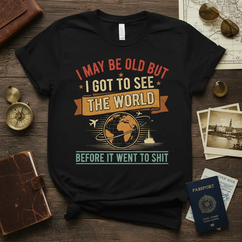 I MAY BE OLD BUT I GOT TO SEE THE WORLD BEFORE IT WENT TO SHIT is more than just a phrase; it’s a statement of experience and a humorous nod to a bygone era of travel. This unique t-shirt captures the sentiment of those who have witnessed the world’s transformation firsthand, offering a blend of nostalgia and wit. It’s designed for individuals who appreciate the value of exploration and have a story to tell, making it a perfect conversation starter and a comfortable addition to any wardrobe. Embrace your journey and your wisdom with this distinctive piece.