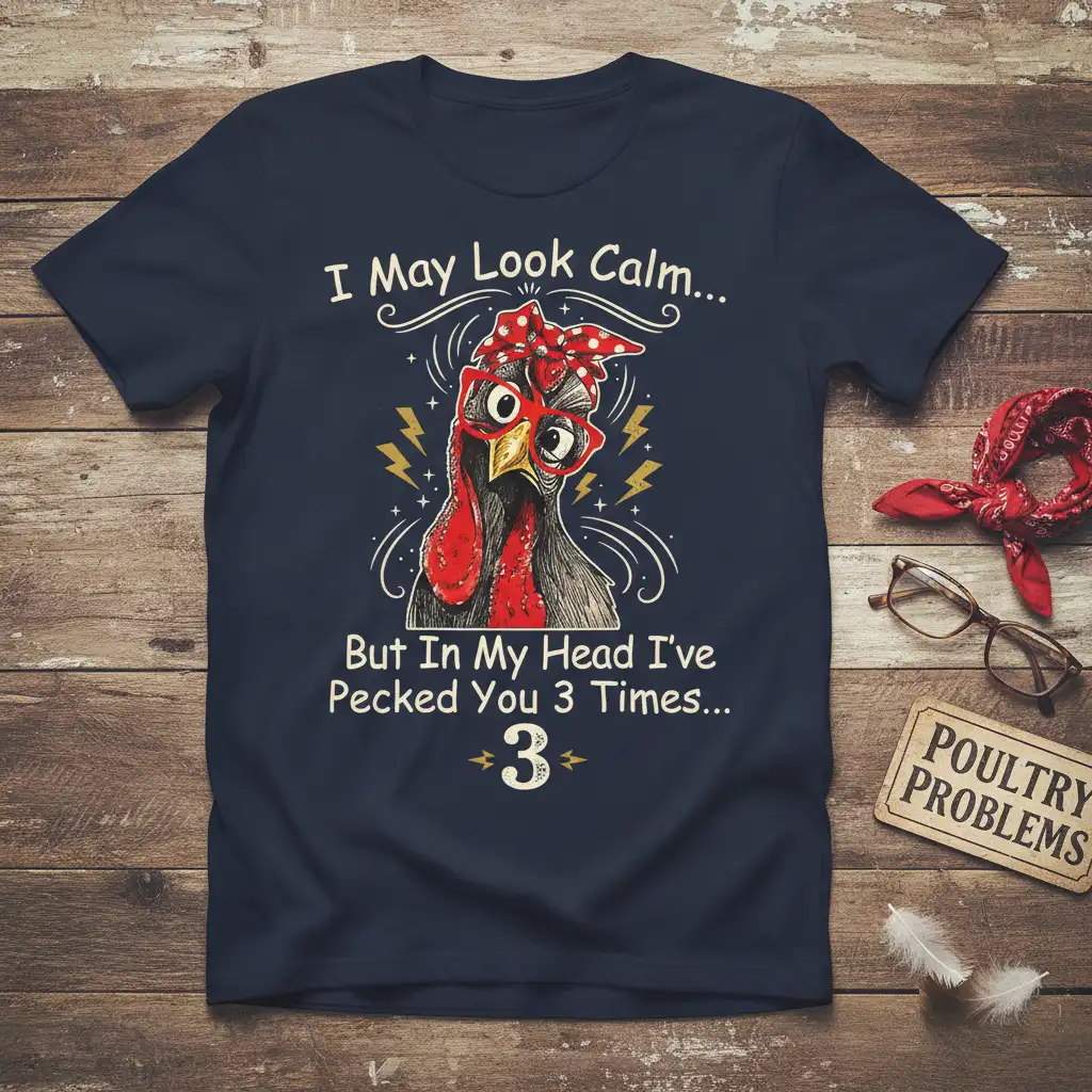 This t-shirt is designed for individuals who appreciate clever humor and enjoy expressing themselves through their clothing. The phrase “I May Look Calm But In My Head I’ve Pecked You 3 Times” resonates with many, offering a relatable and funny take on internal monologues and perceived composure. It’s a perfect way to inject some personality into your wardrobe and spark conversations.
