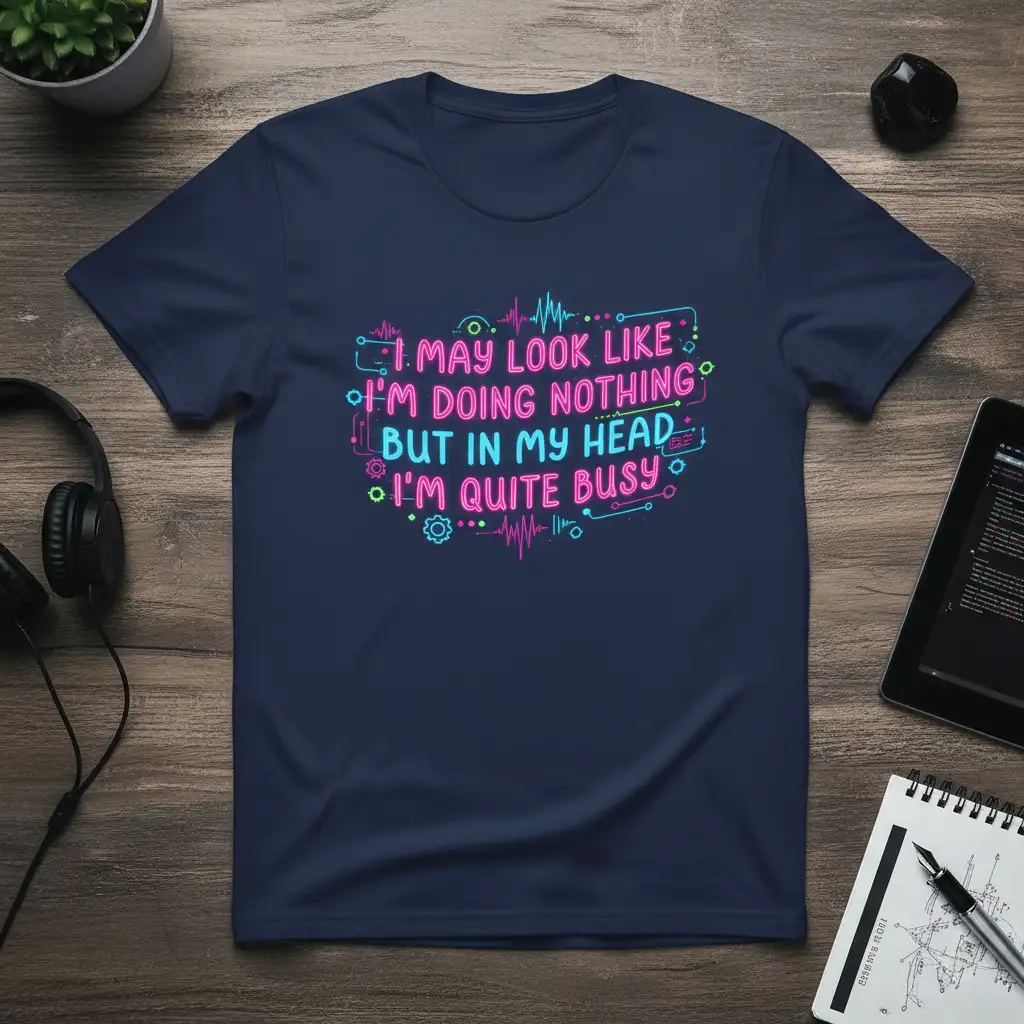 I MAY LOOK LIKE I’M DOING NOTHING BUT IN MY HEAD I’M QUITE BUSY is more than just a phrase; it’s a relatable anthem for the thinkers, dreamers, and creators among us. This t-shirt captures that feeling perfectly, making it an ideal addition to any wardrobe for those whose minds are always racing with ideas, plans, and endless possibilities. It’s a humorous and stylish way to communicate your inner world to the outside, acknowledging the constant activity happening behind a calm exterior. This design is crafted for comfort and visual appeal, ensuring you look as good as you feel while embracing your contemplative nature.