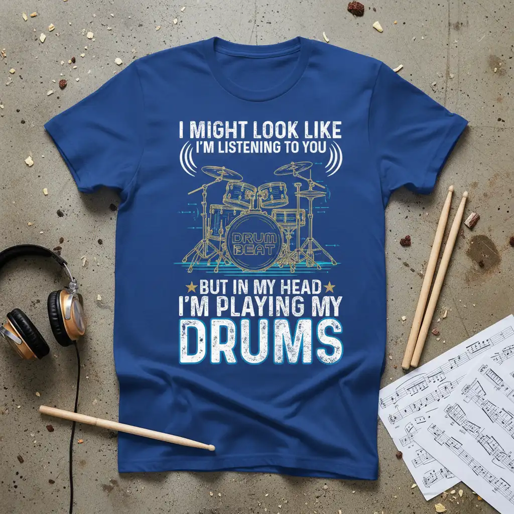 I Might Look Like I’m Listening To You But In My Head I’m Playing My Drums T-Shirt is designed for every drummer who feels the rhythm in their soul, even when they’re just trying to appear attentive. This shirt perfectly captures the common experience of musicians whose minds are constantly filled with beats, fills, and melodies. It’s more than just apparel; it’s a badge of honor for those who live and breathe percussion, celebrating the internal soundtrack that accompanies everyday life. This design makes a fantastic gift for any percussionist, band member, or music enthusiast.