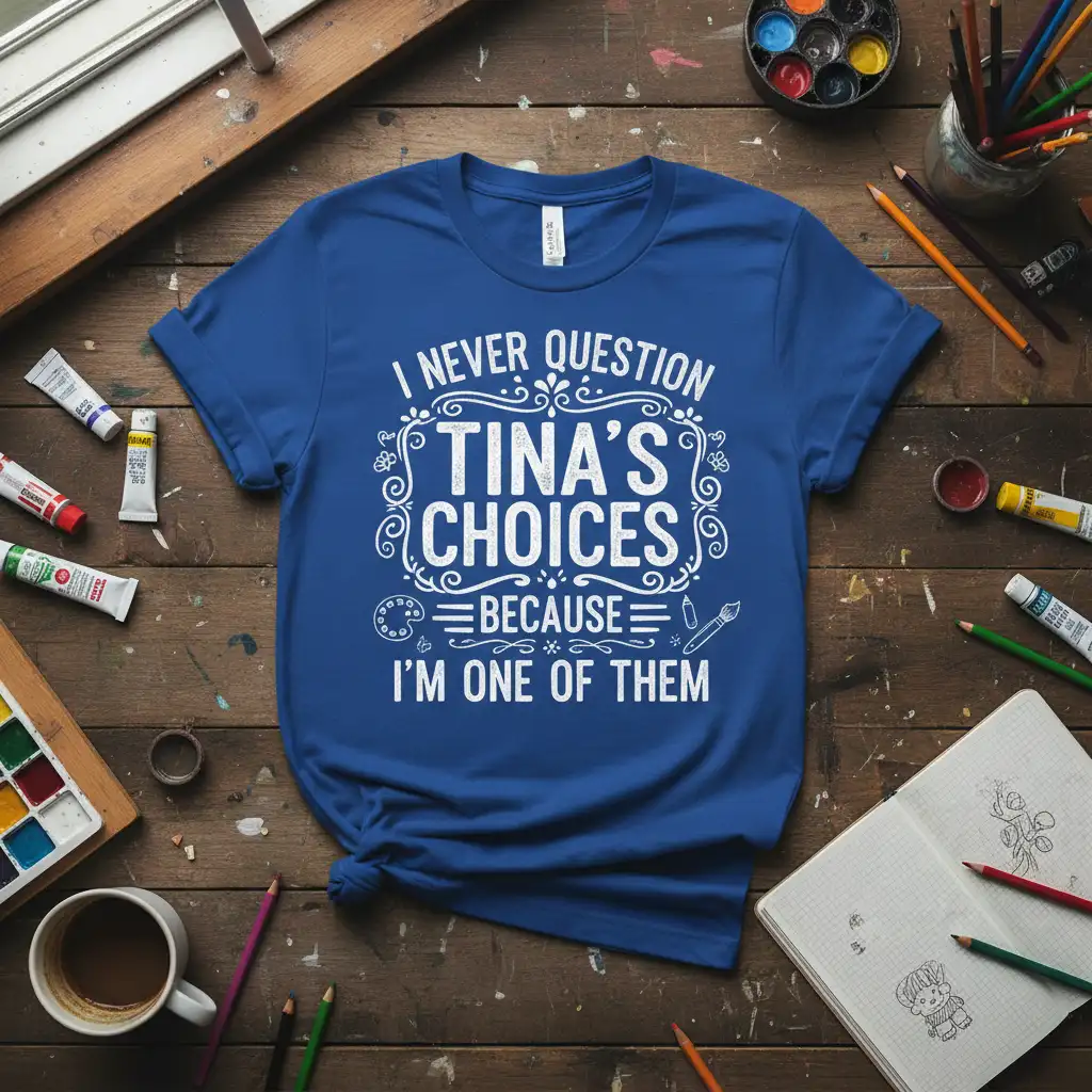 This t-shirt serves as a wonderful expression of appreciation for Tina and her insightful choices. The witty phrase, “I NEVER QUESTION TINA’S CHOICES BECAUSE I’M ONE OF THEM,” highlights her significance and the trust placed in her. It’s a casual yet profound statement that resonates with anyone who has a Tina in their life they admire and respect deeply.