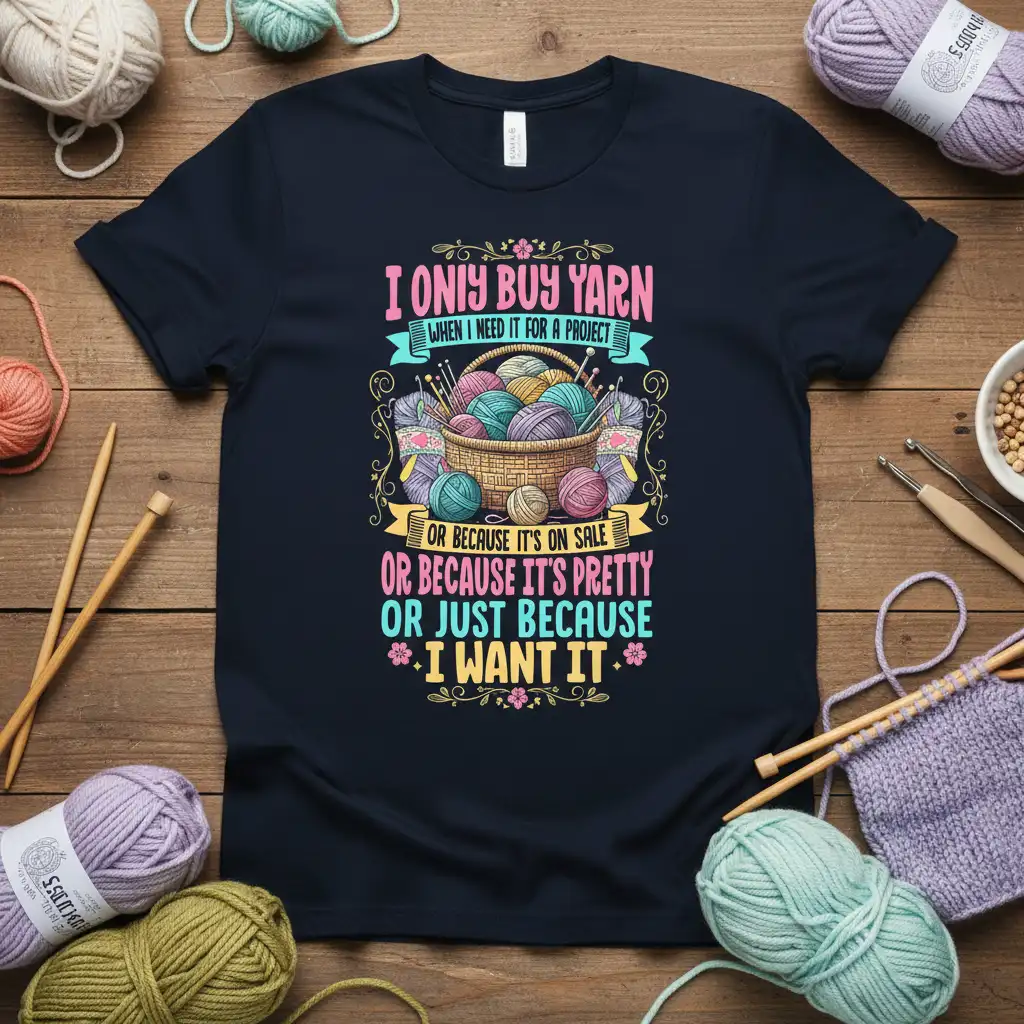 I ONLY BUY YARN WHEN I NEED IT FOR A PROJECT OR BECAUSE IT’S ON SALE OR BECAUSE IT’S PRETTY OR JUST BECAUSE I WANT IT. This statement tee is designed for the passionate yarn lover, the dedicated knitter, and the enthusiastic crocheter who understands the thrill of acquiring new skeins. It humorously acknowledges the many, often whimsical, reasons behind a yarn stash’s growth. Whether it’s for a specific project, a fantastic sale, or simply because the yarn is too beautiful to resist, this shirt speaks to the heart of every fiber artist. It’s more than just clothing; it’s a badge of honor for anyone who finds joy and solace in the world of yarn crafts.
