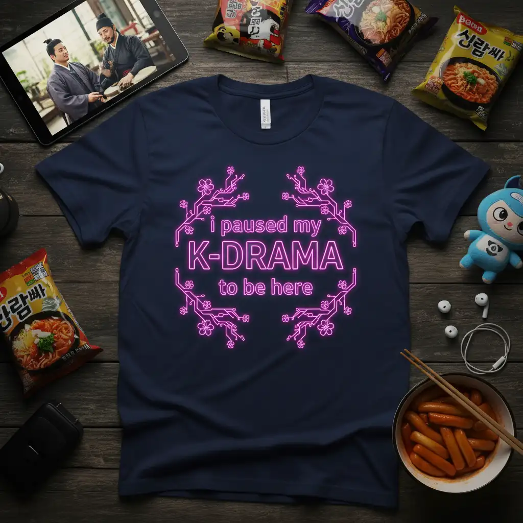 I Paused My K-DRAMA to be here, this phrase perfectly encapsulates the dedication and passion of every true K-drama fan. This t-shirt is more than just apparel; it’s a badge of honor for those who understand the commitment involved in following their favorite Korean dramas. The striking neon-inspired design adds a unique flair, making it a standout piece for any fan’s wardrobe. It’s the ideal way to express your love for compelling storytelling, captivating characters, and the emotional rollercoasters that only K-dramas can provide.