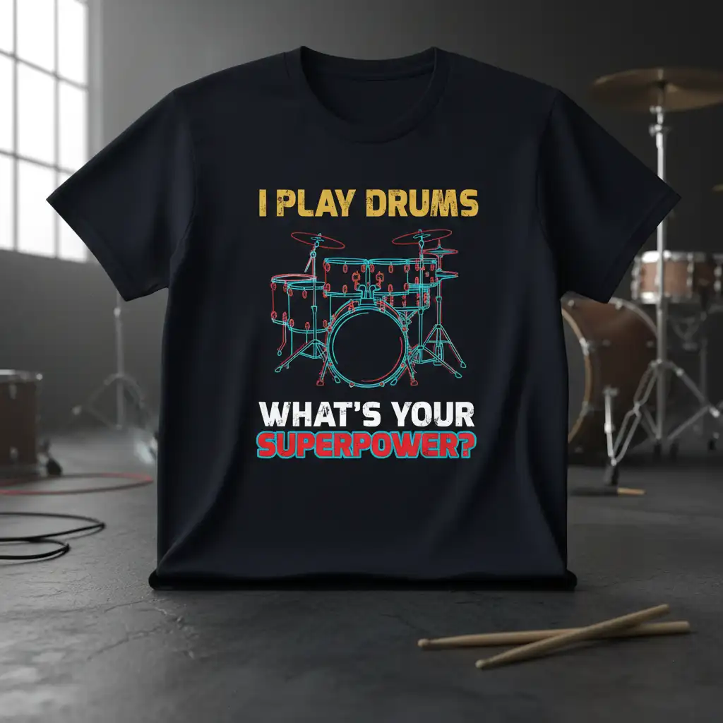 I Play Drums What’s Your Superpower? This statement tee is designed for the passionate percussionist who lives and breathes rhythm. It’s more than just apparel; it’s a declaration of your musical identity and a conversation starter for fellow music enthusiasts. The striking graphic and bold text ensure your love for drumming is seen and celebrated. This shirt is perfect for anyone who finds their ultimate strength behind a drum kit.