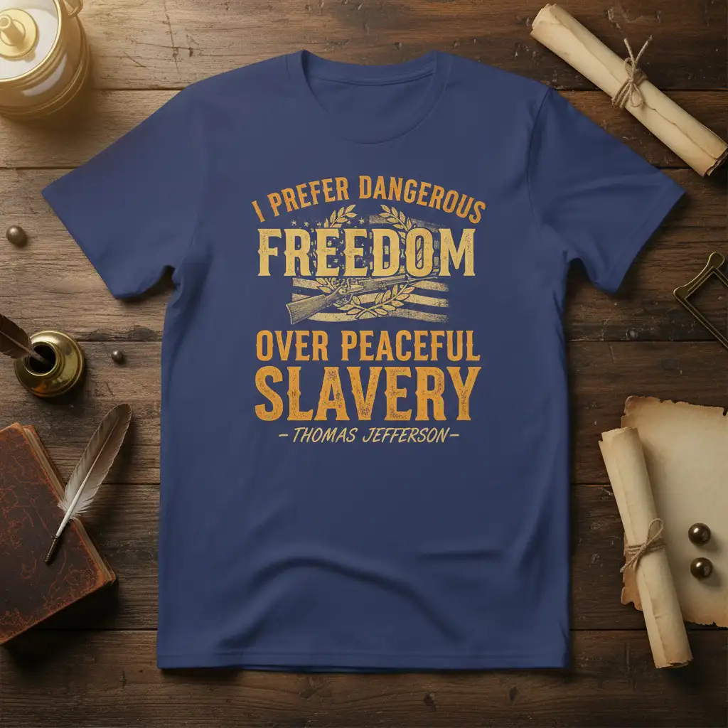 I PREFER DANGEROUS FREEDOM OVER PEACEFUL SLAVERY is more than just a statement; it’s a philosophy etched into the fabric of history and now available for you to wear. This powerful quote, attributed to Thomas Jefferson, resonates with those who understand the true value of liberty and the sacrifices often required to maintain it. This t-shirt is designed for individuals who appreciate historical significance and want to express their commitment to freedom with pride and conviction. It serves as a constant reminder of the principles that underpin a free society.