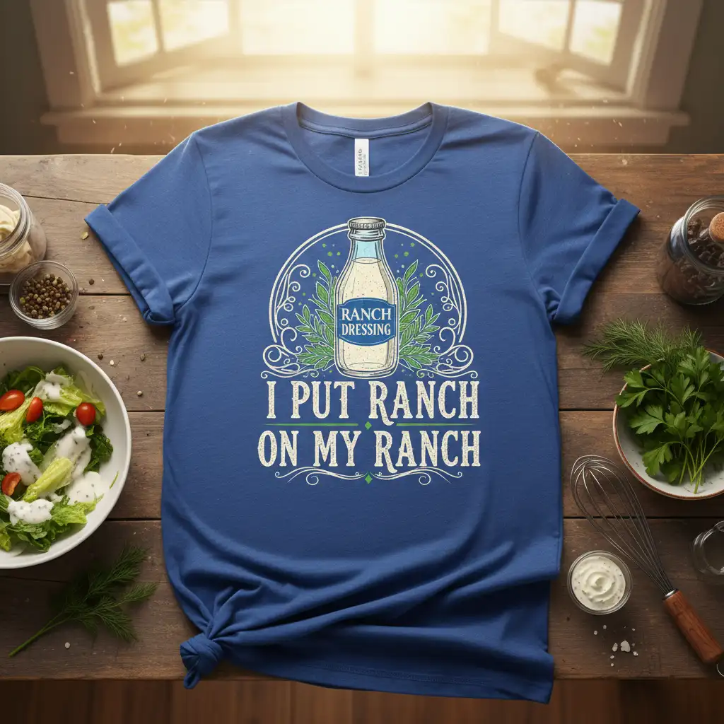 I Put Ranch On My Ranch on everything? Then this t-shirt is your ultimate statement piece. Designed for those who believe that ranch dressing is the perfect accompaniment to any meal, this tee captures that sentiment with humor and style. It’s more than just apparel; it’s a declaration of your culinary preferences and a conversation starter for fellow food enthusiasts. Show the world your delicious devotion to this creamy, tangy delight.