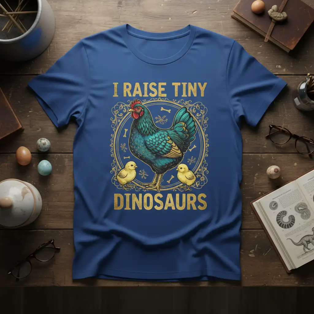 This eye-catching t-shirt features a captivating design that perfectly encapsulates the playful notion of chickens as modern-day dinosaurs. The central graphic depicts a beautifully rendered blue hen standing proudly beside two adorable chicks, all framed by an ornate, distressed golden border. Above them, the bold text “I RAISE TINY” is emblazoned, while below, the word “DINOSAURS” completes the humorous and engaging slogan. This I RAISE TINY DINOSAURS design is a testament to the unique charm and personality of chickens, celebrating their connection to the ancient world in a fun and stylish way.